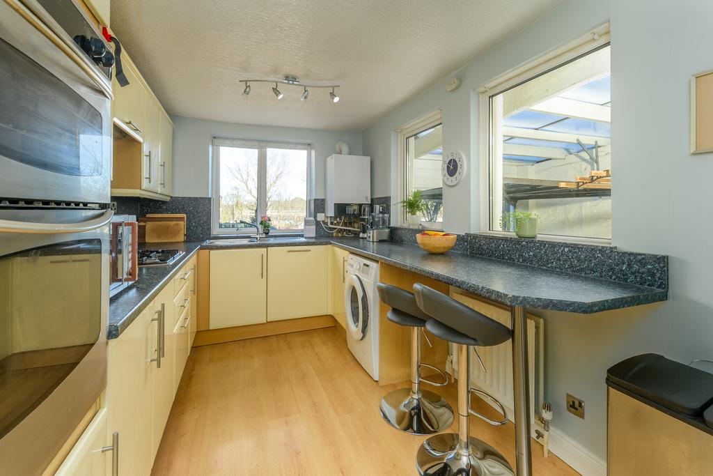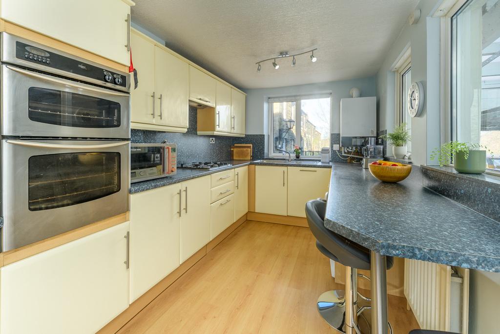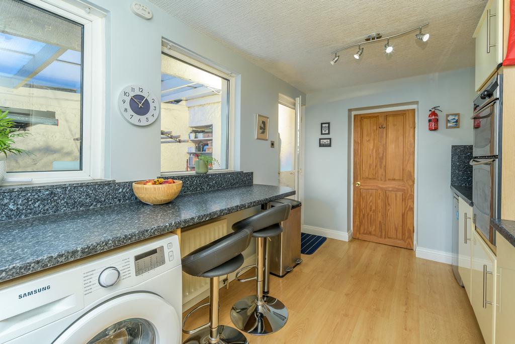 The kitchen is located at the rear of the property and enjoys a pleasant view over neighbouring streets and the pretty gardens. There are a good number of wall and base units complemented by a contrasting granite effect work surface with a matching up stand which extends to the base of the wall units creating a sleek and stylish look. There is an integrated BOSCH dishwasher, a four-burner gas hob beneath a built-in extractor fan, an eye level oven and grill, a glass display cabinet, an integrated under bench freezer, a single bowl stainless steel sink. The gas boiler is here for ease of access and there is plumbing and space for a washing machine. A built-in breakfast bar area provides further seating and a uPVC door opens to the covered rear yard.
