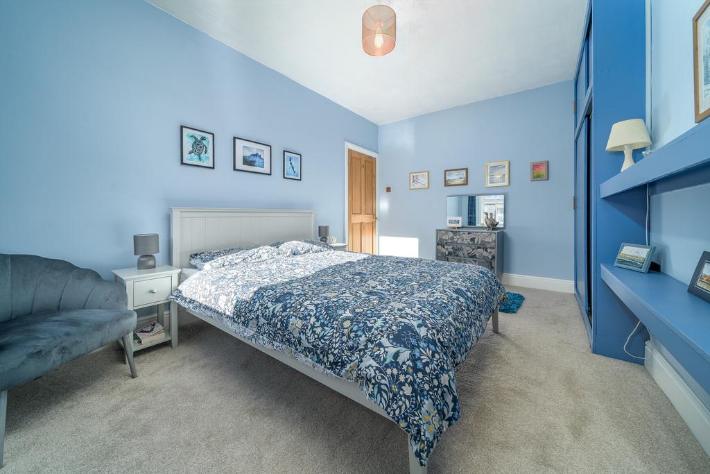 The principal bedroom is a large double room with a window overlooking the front of the property. Painted in blue tones, this room offers sliding door wardrobes with cupboards above.