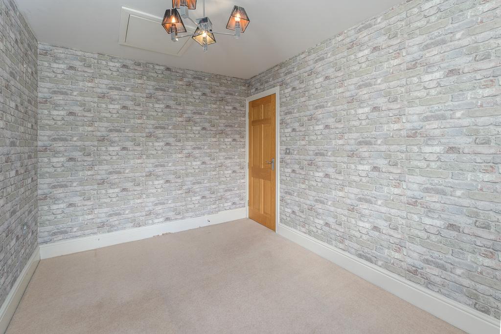 Bedroom 2 is a double room with a window to the front of the property. Loft access is available from here. This light and bright room is finished with stylish brick effect wallpaper.
