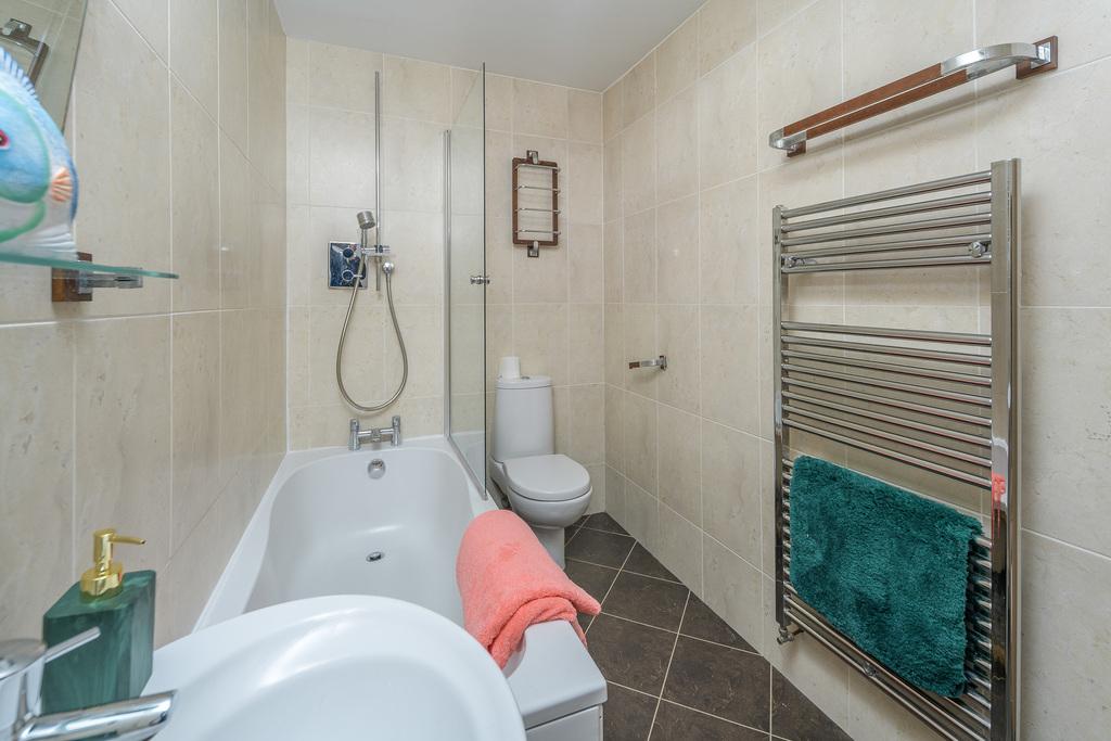 The family bathroom comprises a pedestal wash hand basin with a fitted mirror above and a shelf beneath, a white bath with taps and a separate shower over behind a glass shower screen, a close coupled toilet with a push button behind, a chrome heated towel rail with towel hanger above, ceiling spotlights and an extractor fan. The space is finished with Karndean type flooring and neutrally toned fully tiled walls create a crisp and fresh finish.