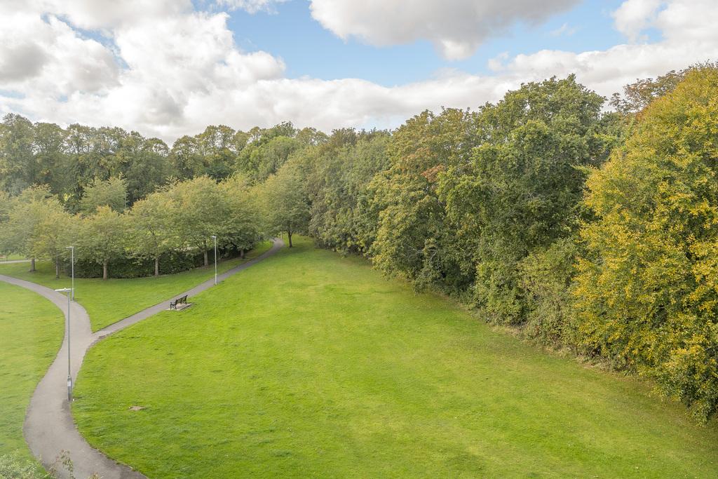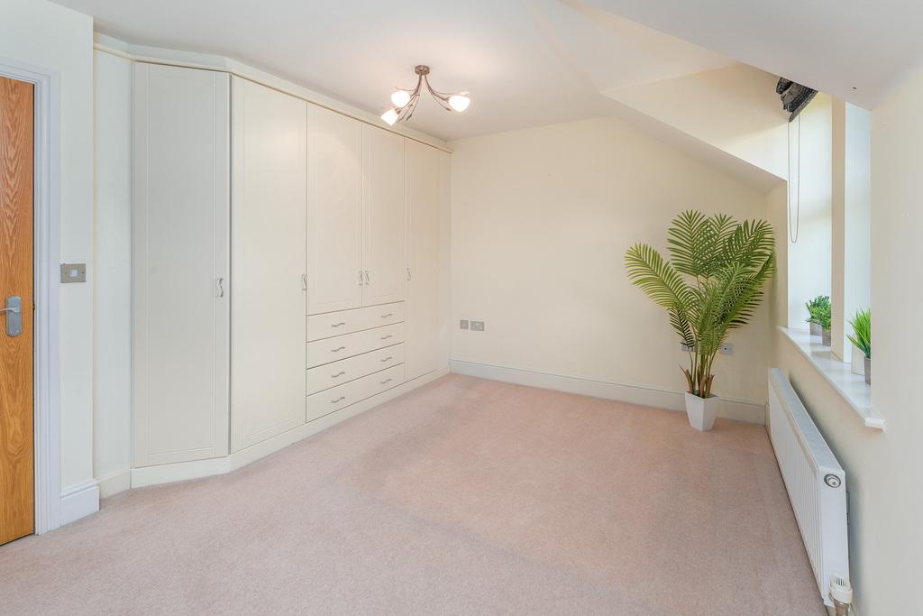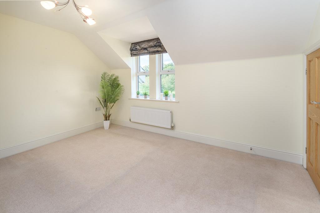 The primary bedroom is an impressive double room with a full bank of built-in wardrobes, some with drawers. A cupboard houses the hot water cylinder for ease of access. A dormer ceiling with a window taking full advantage of those lovely green and leafy views to the rear adds to the appeal of this restful room. The en-suite comprises a pivot door shower cubicle with a separate showerhead within, a pedestal wash hand basin, a close coupled toilet with a push button behind, a chrome heated towel rail, a wall mounted cabinet, ceiling spotlights and an extractor fan. The space is finished with slate grey floor tiles and beige half height tiling to the walls extending to full height within the shower.