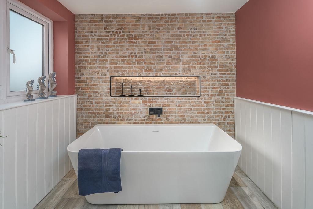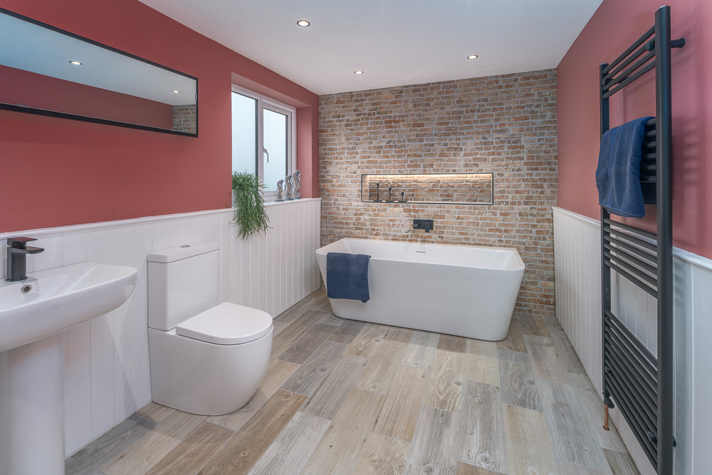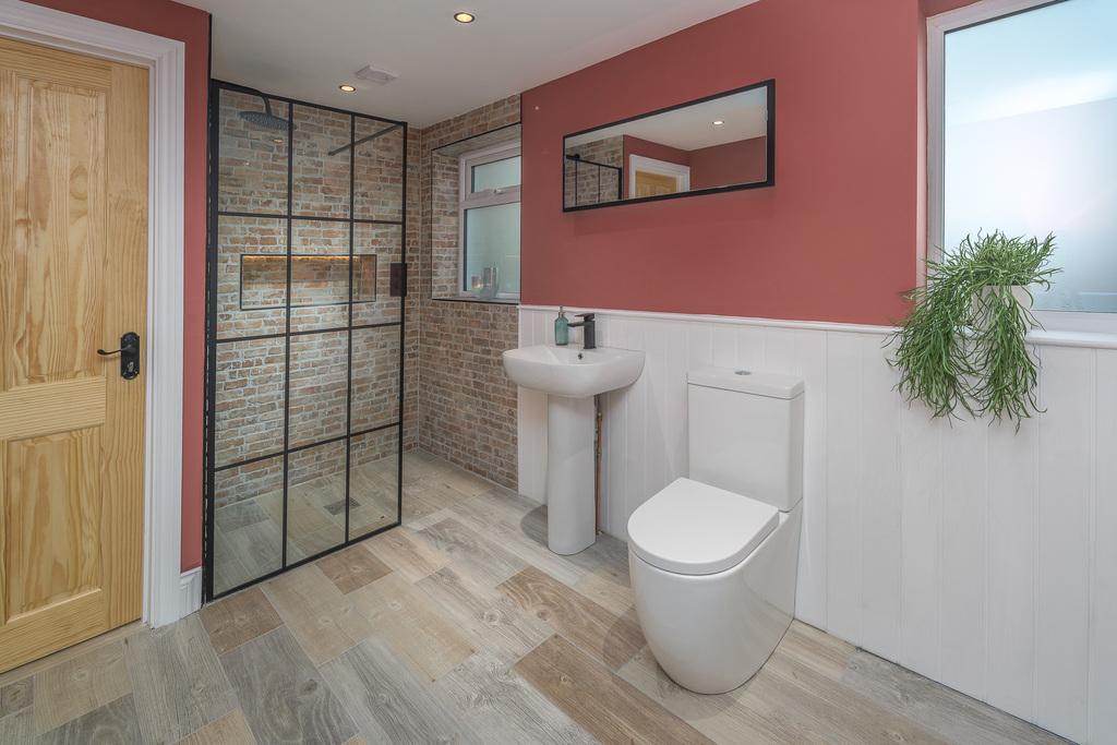 The pretty staircase ascends to a half landing which leads to the newly fitted family bathroom with wood panelling to two walls complemented by brick look tiling and wood look floor tiles which creates a stunning New York loft apartment effect. The suite comprises a large double ended white bath with wall mounted taps and an illuminated niche extending full length, a close coupled toilet with a push button behind, a pedestal wash hand basin with a black tap over, an illuminated mirror, an extractor fan and a black water fall shower head and a separate shower head behind a walk behind black and glass shower screen with a wet room floor and external controls. Under floor heating, Natural light enters via two windows overlooking the side of the property with additional lighting by way of ceiling spotlights. A black heated towel rail ensures added comfort.