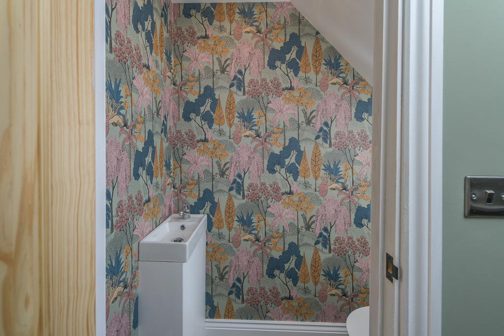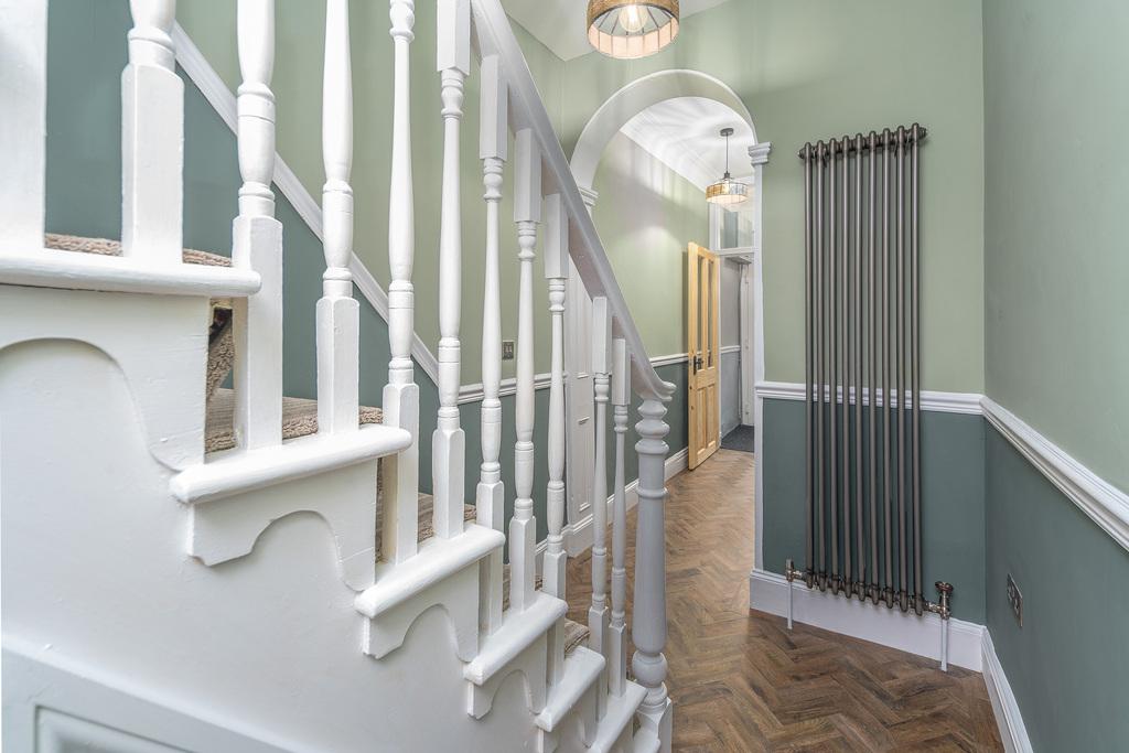 The composite front door opens into an internal porch with original coving and stunning décor including Victorian style radiators which add further charm. A wood and glass door leads into the main hallway with stairs ascending to the first floor and two doors leading off. Karndean-type flooring in a parquet herringbone design extends to most of the ground floor areas creating a seamless transition between the different spaces in addition to working in harmony with the dado rail and coving ensuring a stylish look. The space beneath the stairs has been creatively remodelled to incorporate a beautifully decorated ground floor visitor’s WC. The suite comprises a vanity unit with a sink on top and a close coupled toilet with a push button. Adjacent is a useful storage cupboard.