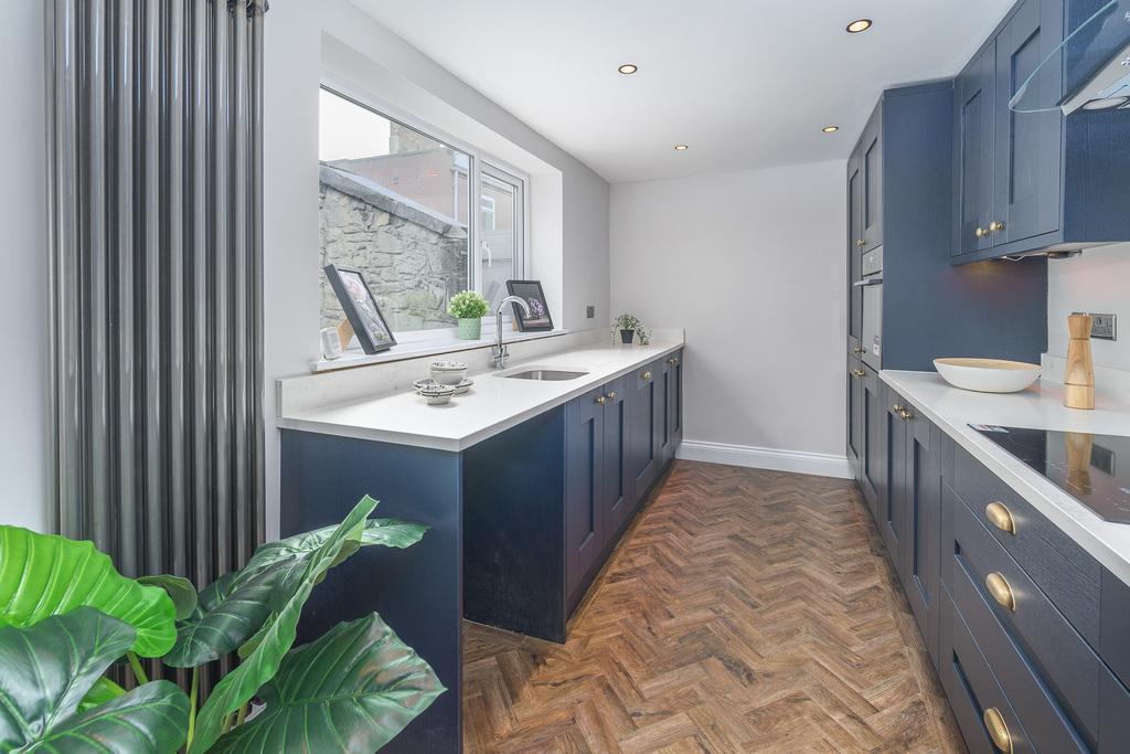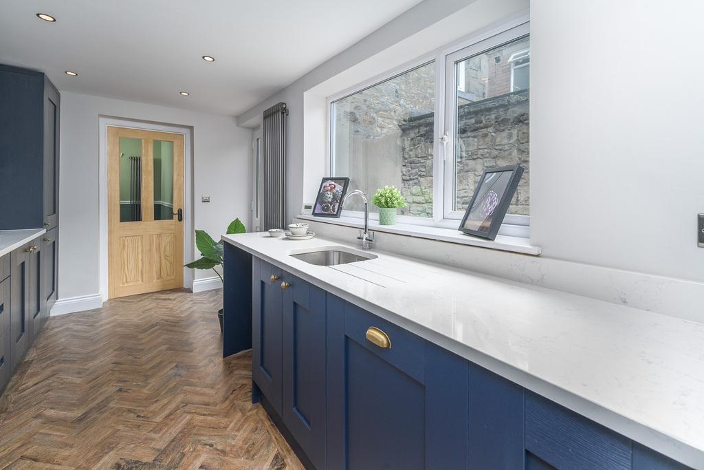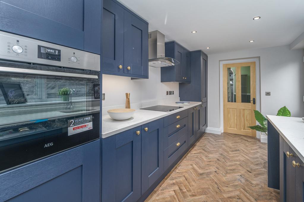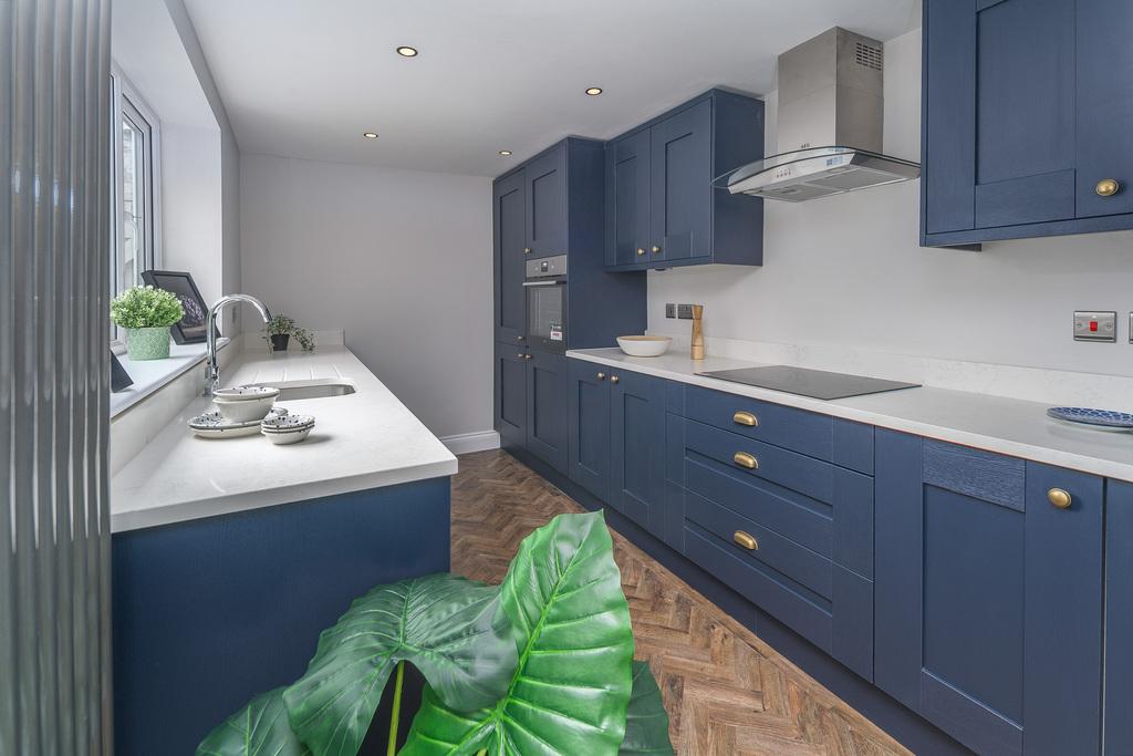 Located at the rear of the property, the newly fitted kitchen offers a good number of wall and base units with grey interiors and soft-close navy-blue doors complemented by a white granite work surface with a matching upstand. There is a single bowl stainless steel sink dropped into the granite work surface with a drainer cut in to the side, a fully integrated fridge-freezer, an AEG induction hob beneath an AEG extractor fan, an eye-level AEG oven and a fully integrated full-sized dishwasher. There is plumbing and space for a washing machine and the newly fitted boiler is housed in a cupboard for ease of access. The space is finished with bushed chrome switches and sockets, ceiling spotlights and a designer-looking radiator. Natural light enters via a large window overlooking the rear and a uPVC door provides access to the rear courtyard.