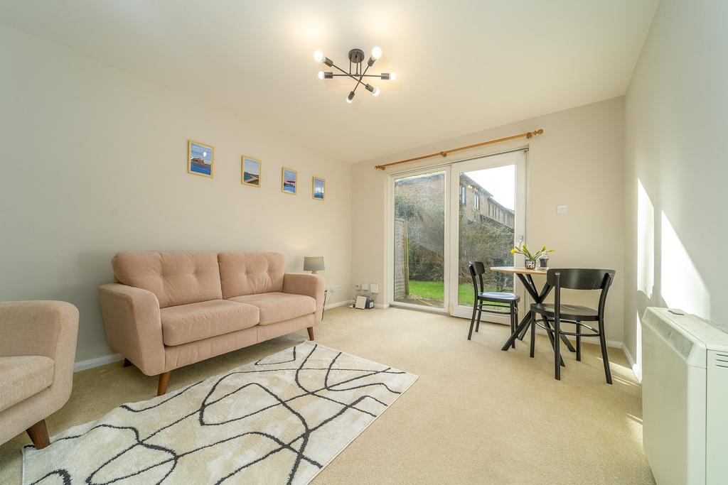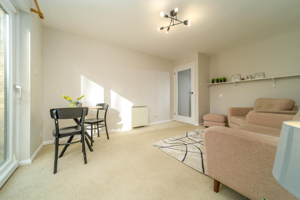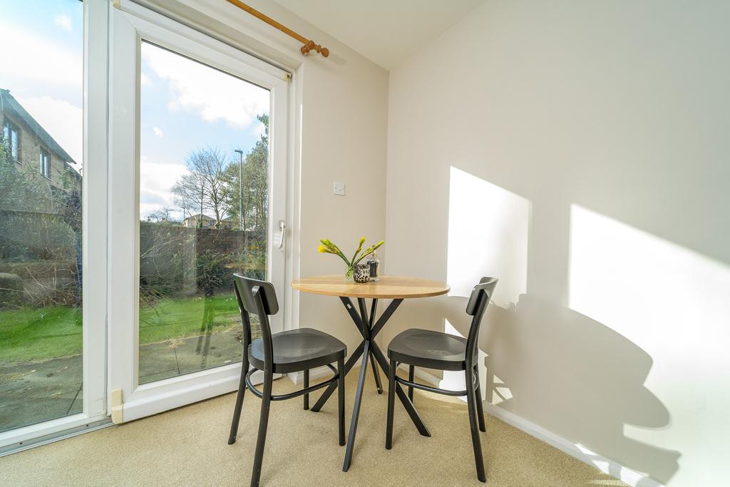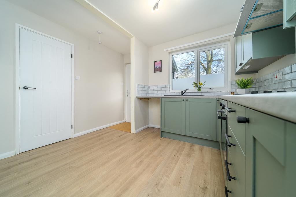 The space flows freely into the L shaped kitchen which offers a good number of wall and base units with a muted, green-coloured door complemented by a contrasting pale grey laminate work surface and grey brick style tiled splashback. A large window overlooks the front of the property capturing views of trees and shrubs which afford privacy. In terms of fitted equipment, there is an electric oven, a single bowl charcoal grey sink with a black mixer tap above and a four-ring electric hob beneath a stainless-steel chimney style extractor fan. There is space for a free-standing fridge-freezer and plumbing and space for a washing machine. You can comfortably dine within this well-designed kitchen which is completed with wood-look LVT flooring creating a stylish finish.