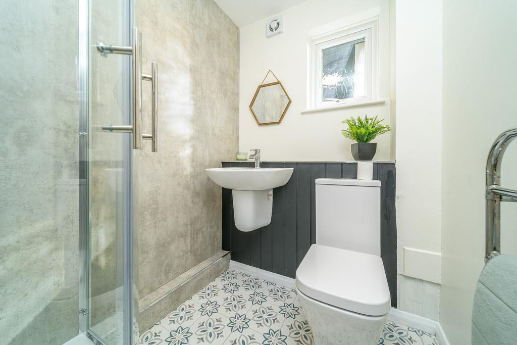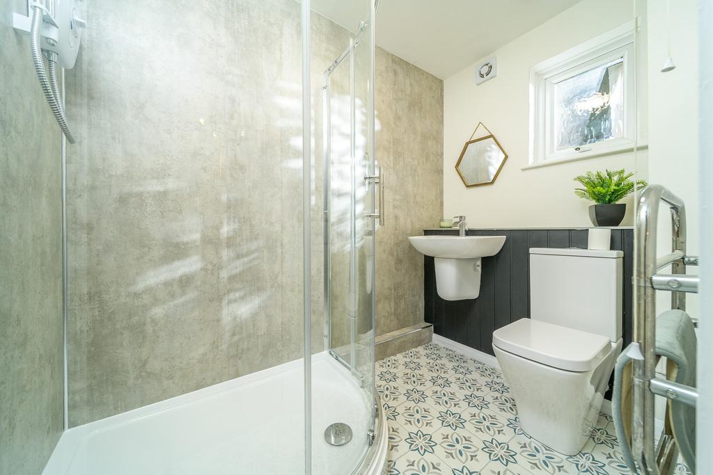 Spacious and airy, the newly refitted shower room comprises a double sized shower cubicle with concrete-look wet walling and an electric shower within, a semi-pedestal wall hung hand wash basin with a chrome mixer tap above, an extractor fan, a close coupled toilet with a push button flush behind and a useful shelving unit above. A window, with privacy glass, allows for natural light which illuminates the Moroccan style floor tiling beautifully.