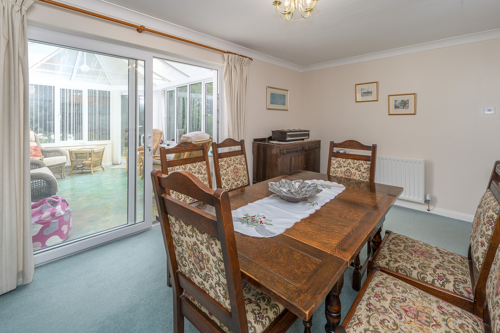 The dining room is a stunning room which takes advantage of views to the rear. A pair of sliding doors open into a conservatory, with a polycarbonate roof, which offers further comfortable living space and is the perfect place in which to relax and unwind, throughout every season, whilst enjoying the garden views entering via the many windows. Amtico flooring completes the space and fitted blinds ensure added comfort during those sunny days.
