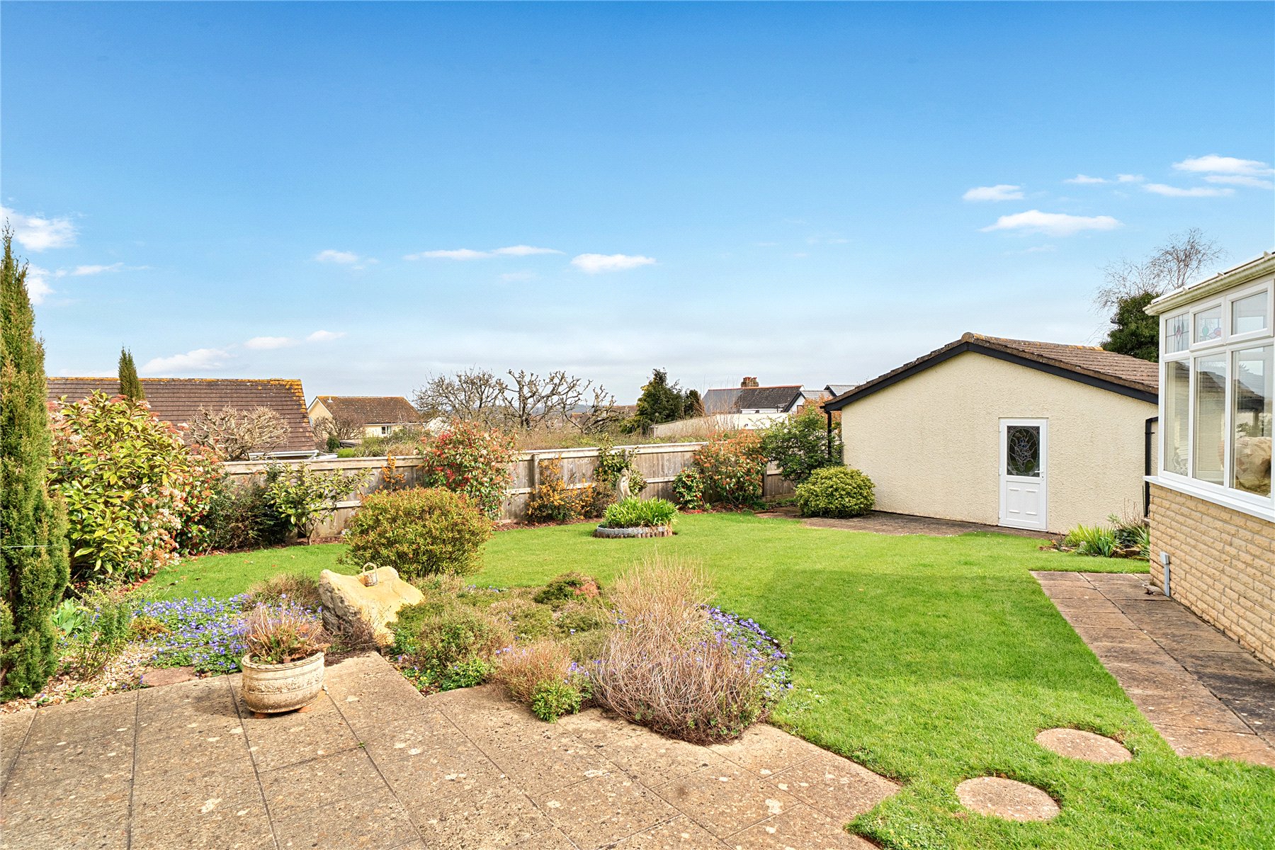 Outside, the property is accessed via a shared driveway leading to a pillared entrance and private driveway with parking for at least five cars. A double garage features twin remote-controlled doors, power, light, and a patterned-glass courtesy door to the side. The gardens are a mix of lawns, sun patios, beautifully planted borders, paved pathways, sheds, and further planted and gravelled areas, all enclosed with a side pedestrian gate and outside courtesy lighting.