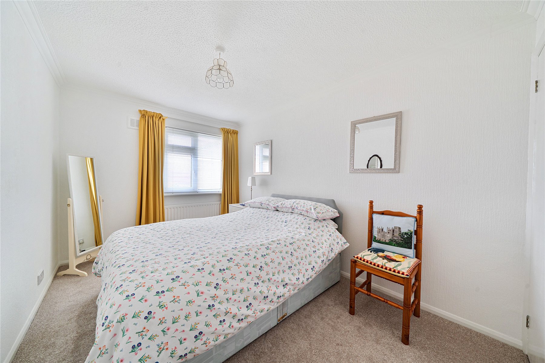 From the hallway, doors lead to the bedrooms and home office. The first double bedroom has a radiator and opens into a conservatory, which has tiled flooring, a radiator, double-glass windows overlooking the gardens and countryside beyond, and double doors to the gardens. The home office or additional bedroom features a double-glazed window, radiator, and fitted book shelving. Another double bedroom overlooks the gardens and includes a fitted double wardrobe.