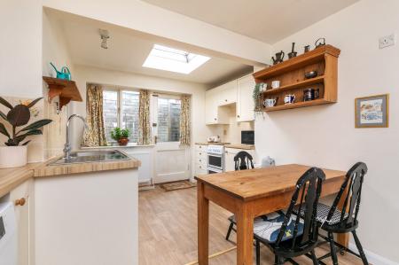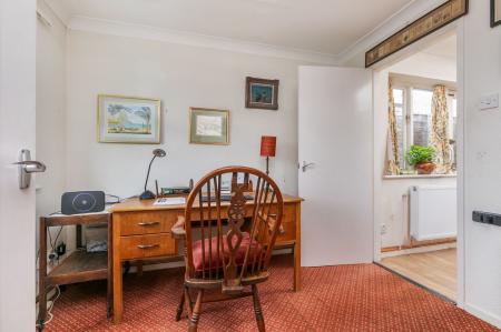 With accommodation approaching 1200 square feet, the property comprises a spacious sitting room with twin windows to the front aspect and an electric fire. Leading from the sitting room there is a separate study/home office room. The extended kitchen offers a range of base and eye-level units, ample space for a breakfast table, and a side door with access in either direction to the rear garden and the road. The principal bedroom lies to the rear of the property with a large window over the rear garden, and a garden door. There is an ensuite shower and toilet. The second bedroom is a large double room, which also has a large window overlooking the rear garden. The third bedroom has been used as a dining room but could easily be returned to a bedroom, with a good sized window to the side of the property, and original internal door adjacent to the second bedroom.