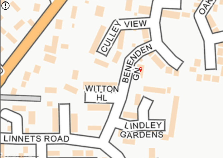 From the centre of the town, proceed down West Street and, at the bottom of the hill, turn left into Jacklyns Lane. Go under the railway bridge, up the hill and down the other side and turn left into Linnets Road. Drive up the hill and, at the top, turn left into Benenden Green where No.6 will be found on the right hand side before you reach the green.