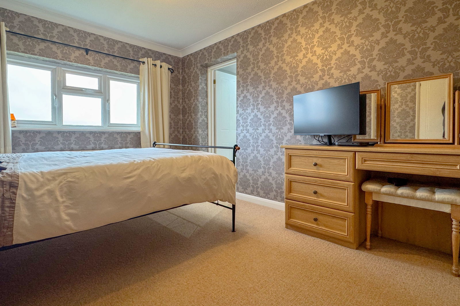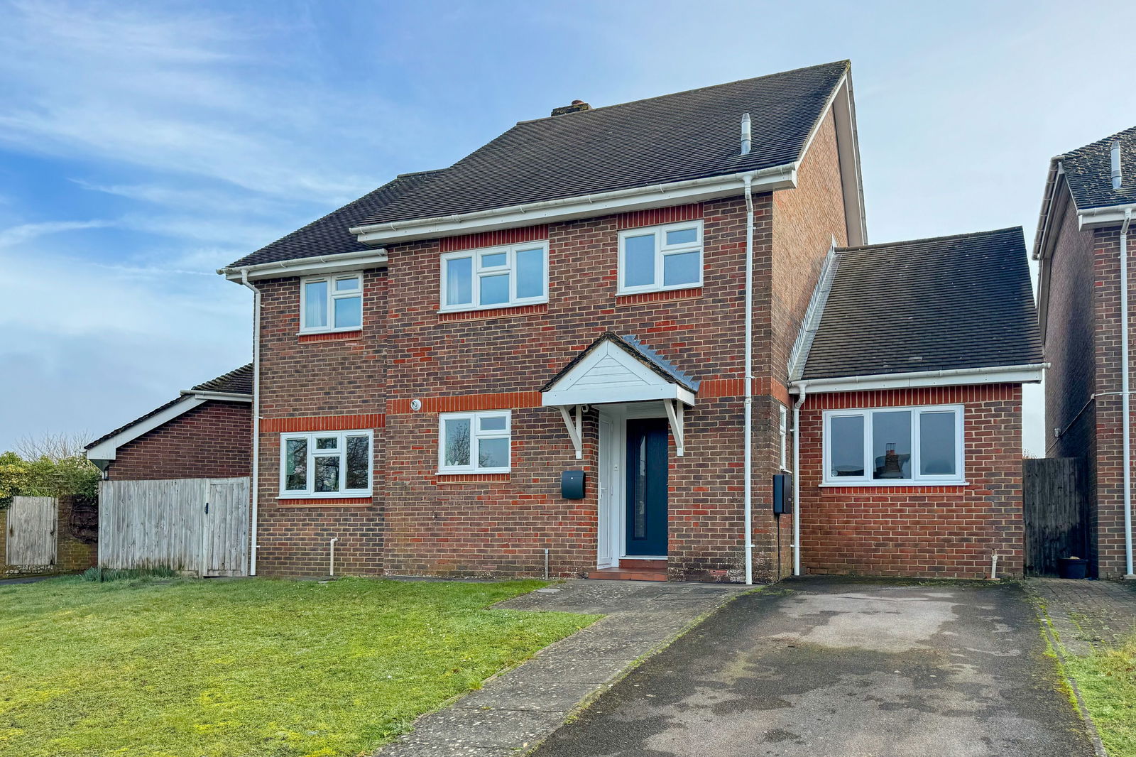 To the front, the house is set back from the road and benefits from ample driveway parking, enhancing both privacy and practicality.