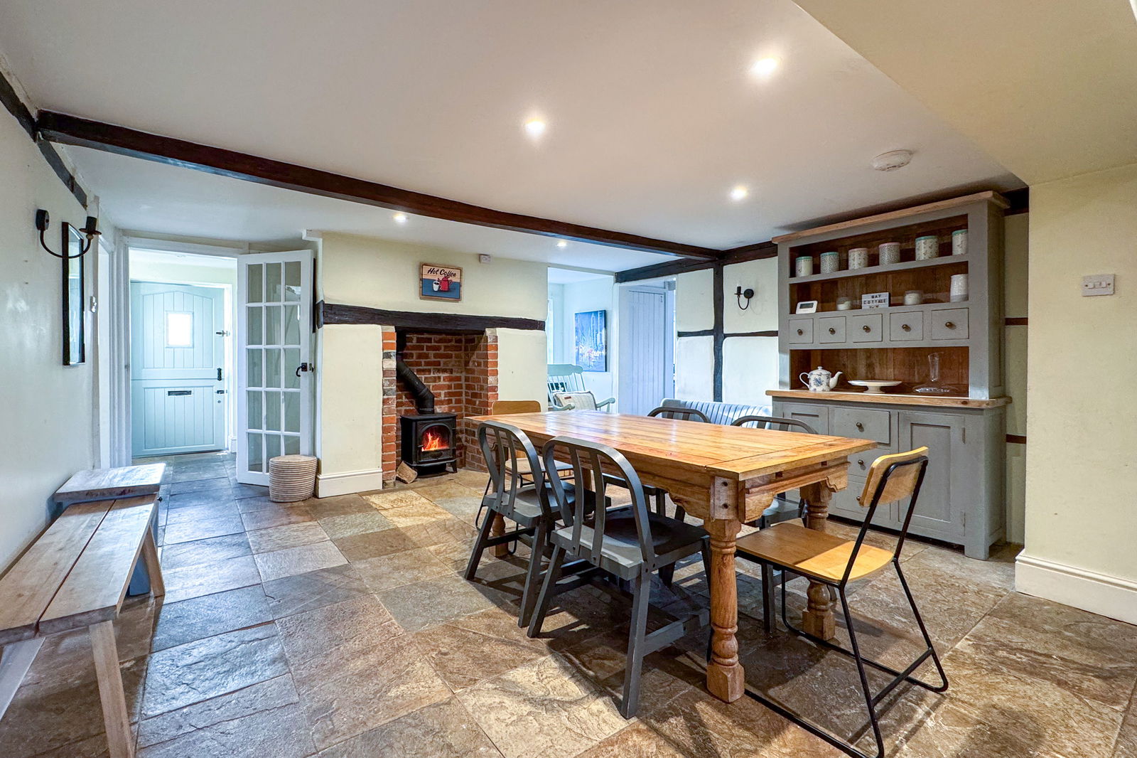 The cottage is approached from the gravel driveway, a lavender bordered path leading to the front door. You enter the property through the porch which leads onto the spacious double aspect kitchen/dining room, which is the heart of the home. Slate flooring, shaker-style units, a built-in dresser, and an AGA add character to the room, as does the fireplace with wood-burning stove. Off the kitchen is a utility room, cloakroom and study. Please note the study is subject to a flying freehold from the neighbouring property. The generously proportioned sitting room straddles the depth of the house, with built-in storage, a fireplace with wood-burning stove, and stairs to the first floor. Double doors lead through to a hallway, where there is a shower room and adjoining storeroom. Wooden ladder stairs lead up to a spacious loft room. A wonderful South facing garden room enjoys a sunny aspect, with French doors opening to the garden.