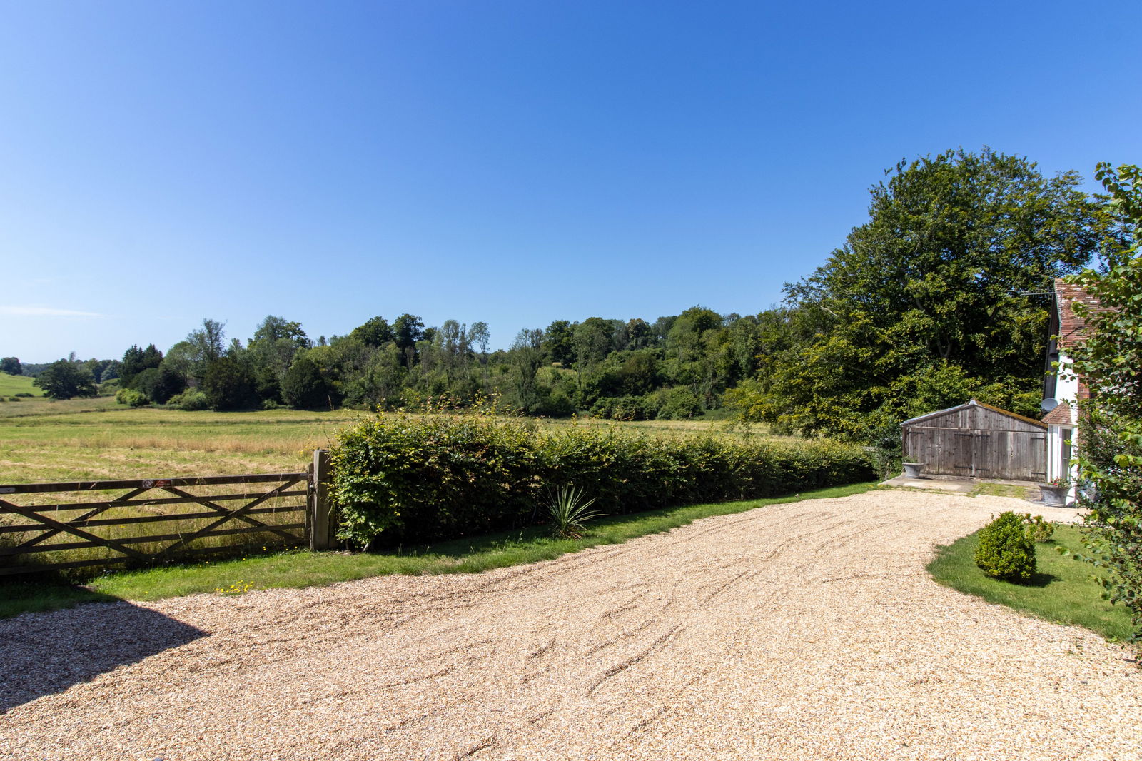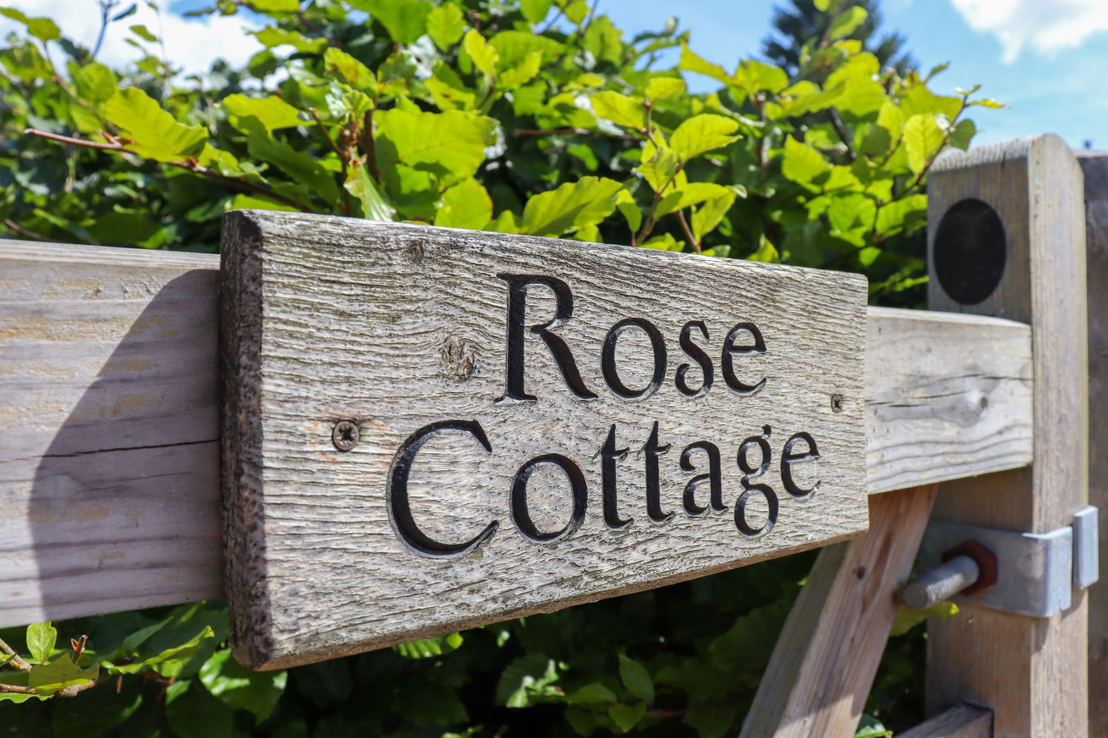 The front garden is enclosed by mature hedging, with a five bar gate allowing access to a gravelled driveway, from where there is a view over a field. The landowner of the field owns the approach to a gate allowing access to the field. We understand that the gate is rarely used. The owners of Rose Cottage have a right of access over the approach to the field. There is a recently-built garage, with a remotely controlled roller shutter door. In addition, there is an outbuilding, which is used as a workshop and storeroom.