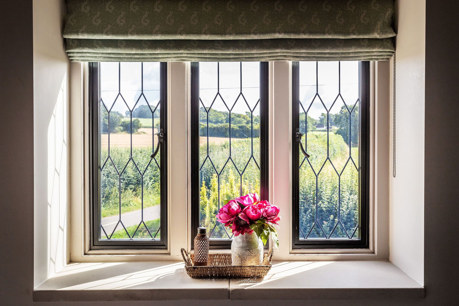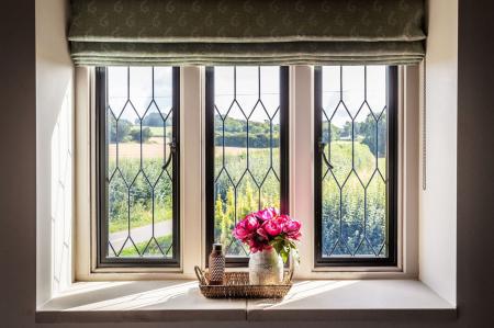 Oak stairs lead up to a spacious landing, where there is a modern shower room and views over the garden. The spacious main bedroom features twin built-in wardrobes, an ensuite bathroom with separate bath and shower, and far-reaching countryside views. There are two further double bedrooms, both having built-in wardrobes.