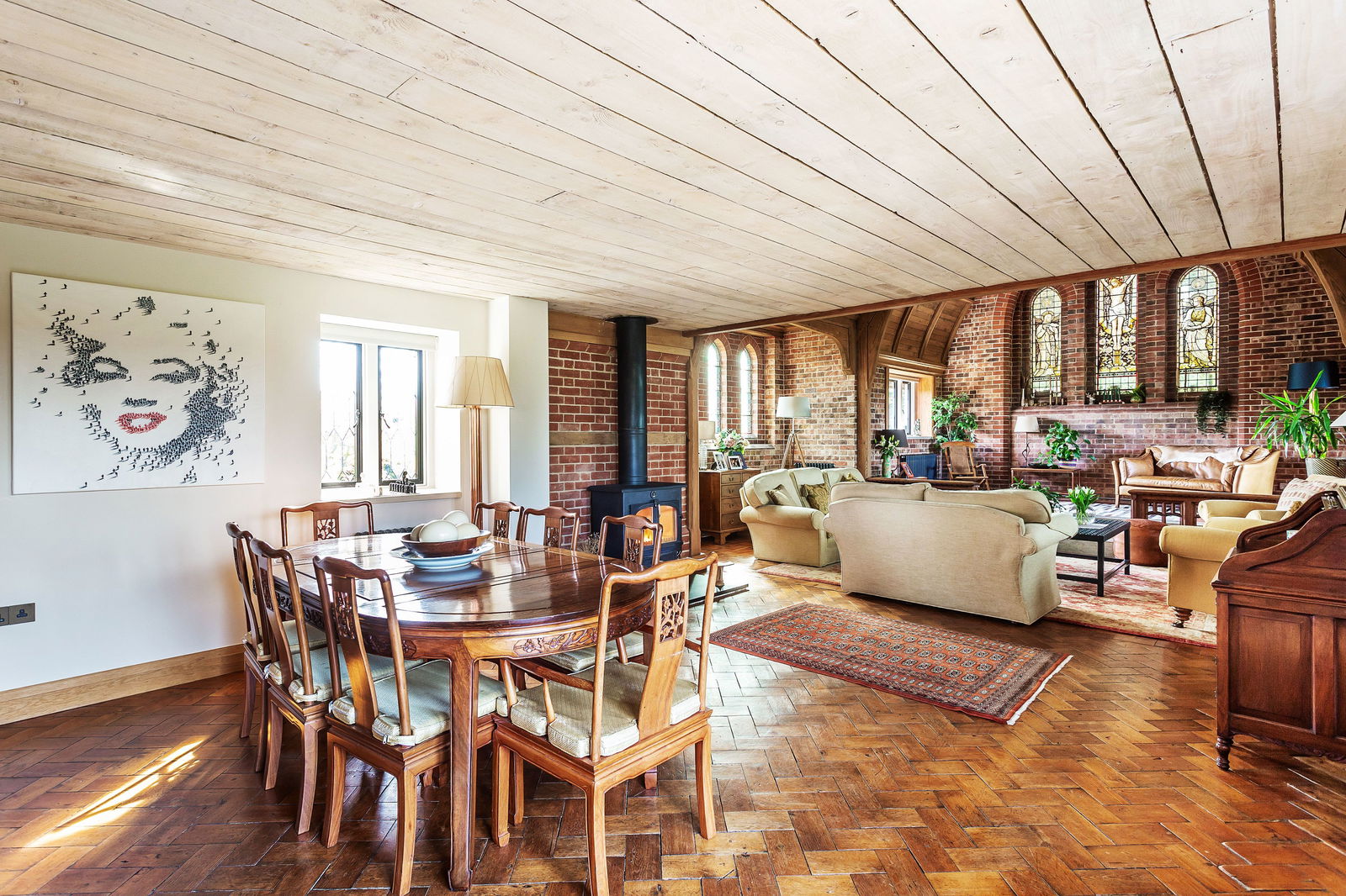 The impressive reception space is a real centrepiece, combining a sitting and dining area with original block flooring, a log burner, and a feature raised seating area, illuminated by a spectacular stained-glass triptych. Windows overlook the garden, and French doors open to the outside terrace. A passage leads to a light and airy garden room, with its own access to the garden.