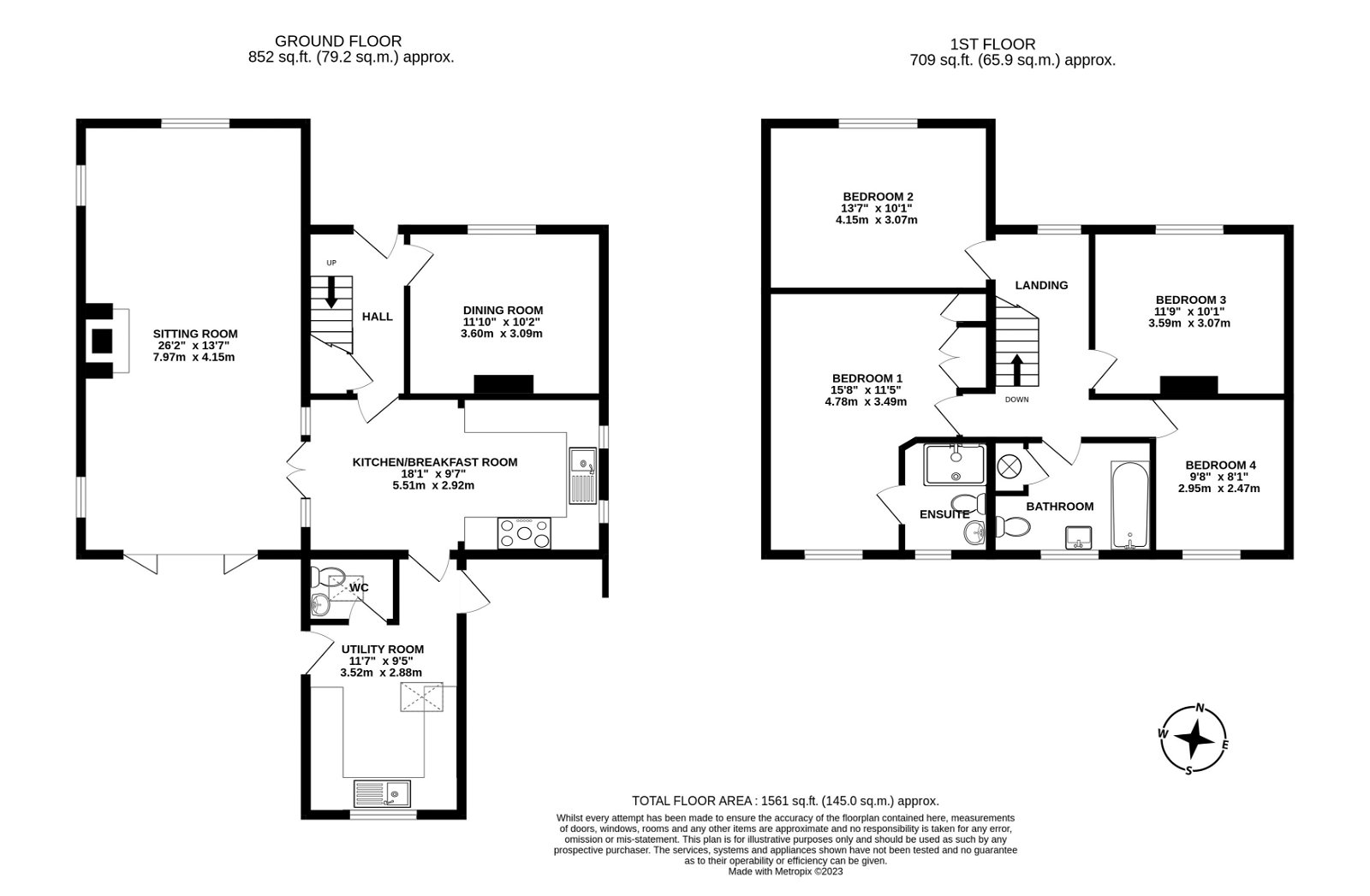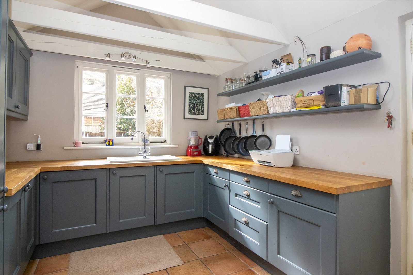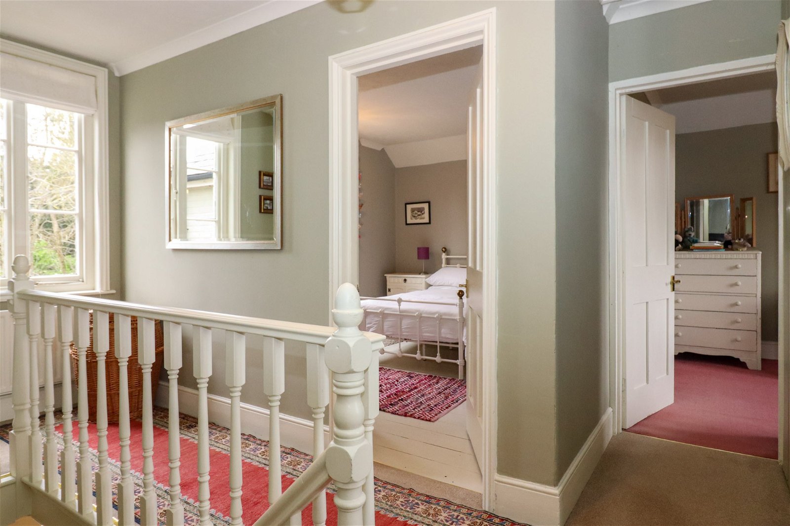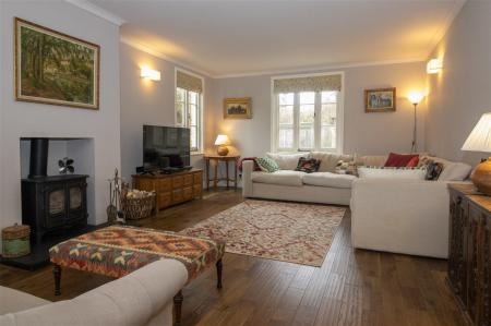 The front door opens to the entrance hall, where stairs lead up to the first floor. A door to the left opens to the dining room, which has a feature fireplace (GT TO CHECK PHOTOS OF THIS ROOM. Ahead of you is the kitchen/breakfast room, which has fitted cupboards and drawers, granite worksurfaces and a Rangemaster electric range cooker and hob, with a matching extractor hood above. There is a large utility room, with fitted storage, worktops, a cloakroom and a door to the garden. Double doors from the kitchen open to the spacious sitting room, which has a wood burning stove in a fireplace surround and French doors to the garden.