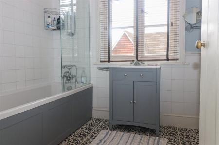 Upstairs, the main bedroom overlooks the garden and has built-in wardrobes and its own en-suite shower room. Bedrooms two and three are both double rooms located at the front of the house. The fourth bedroom is a single room, and the family bathroom has a white bath suite.