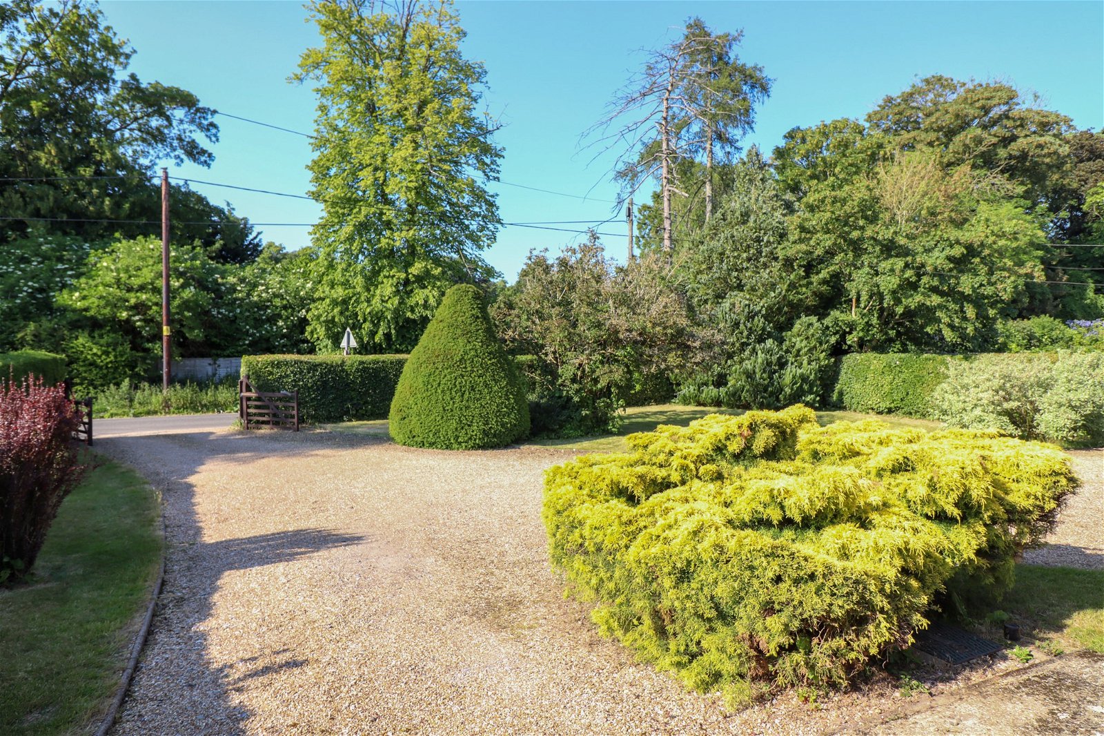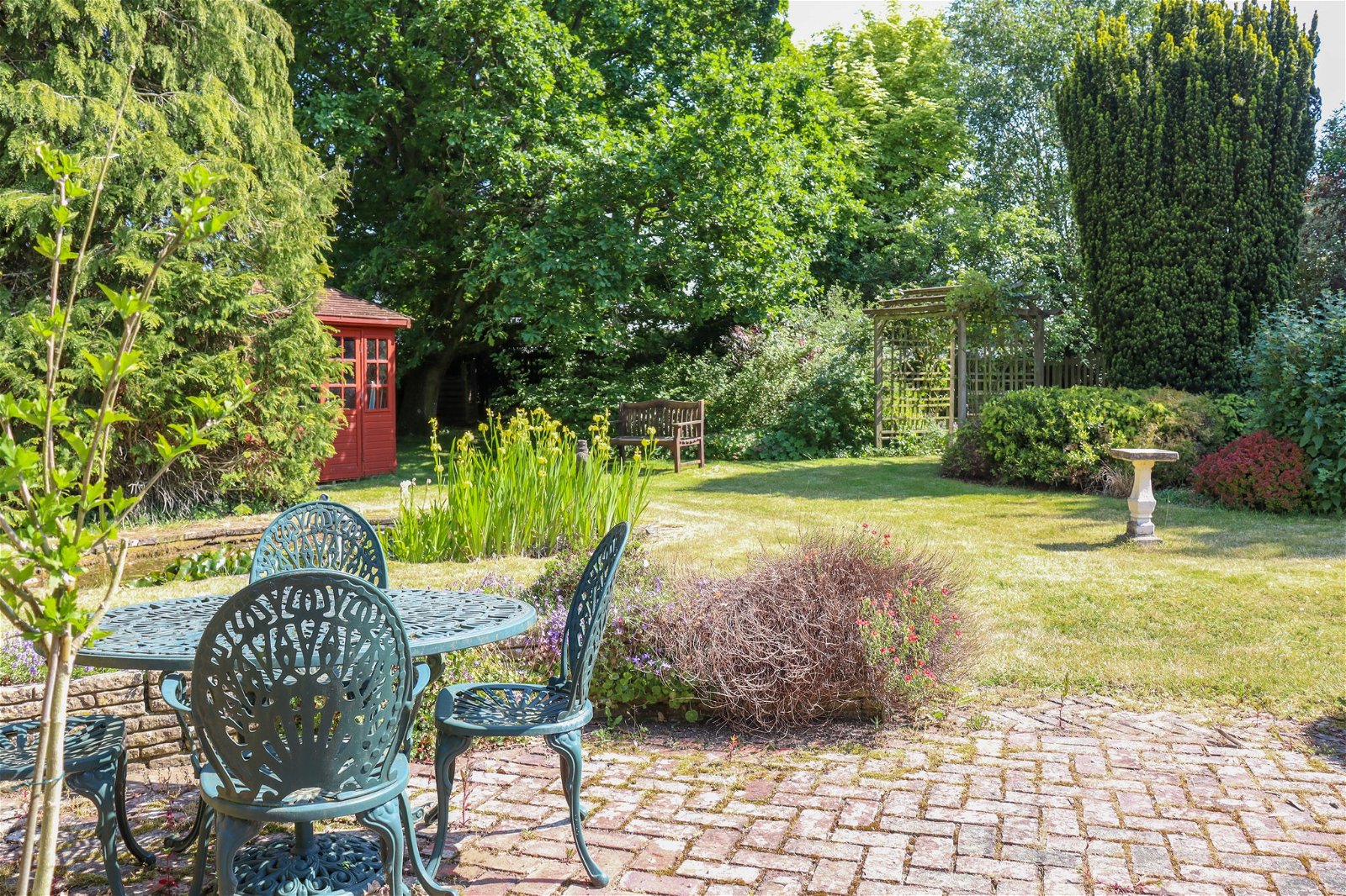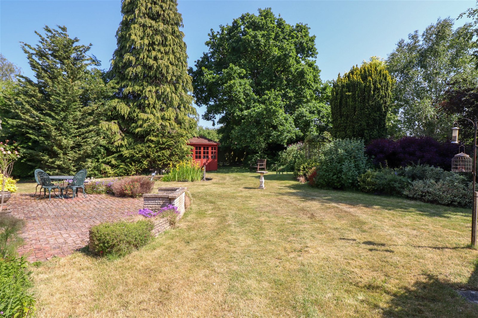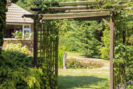 Outside to the front, there is plenty of driveway parking and a mature garden. A side access leads through to the attractive, south-facing rear garden, with a field beyond. The garden is lawned with a seating terrace, an ornamental pond, an arbour and summer house.