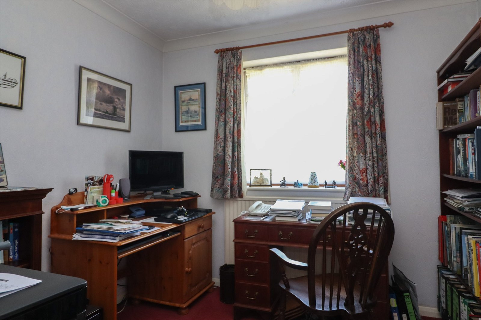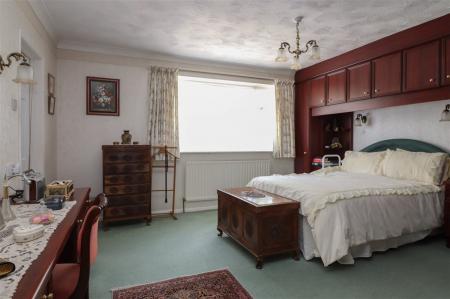 The sizeable main bedroom is at the front of the property, and features a range of fitted wardrobes. There is an attached en-suite shower room with a door to the entrance hall. The second bedroom has a built-in double wardrobe and a wide window overlooking the garden. Bedroom three is currently used as a study.