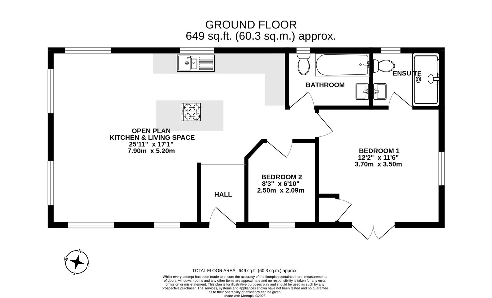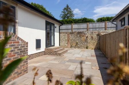 A few steps lead up to the front door, which opens to a hallway, with hooks for coats. The fitted kitchen features a smart range of units and drawers, with worktops above and integrated appliances, as well as a matching island unit. There is a seating area with space for a sofa and easy chair, as well as space for a dining table and chairs. The main bedroom has a built-in wardrobe and French doors to the courtyard garden, as well as an en-suite shower room with a white suite. There is a second, smaller bedroom, and a bathroom with a white suite.