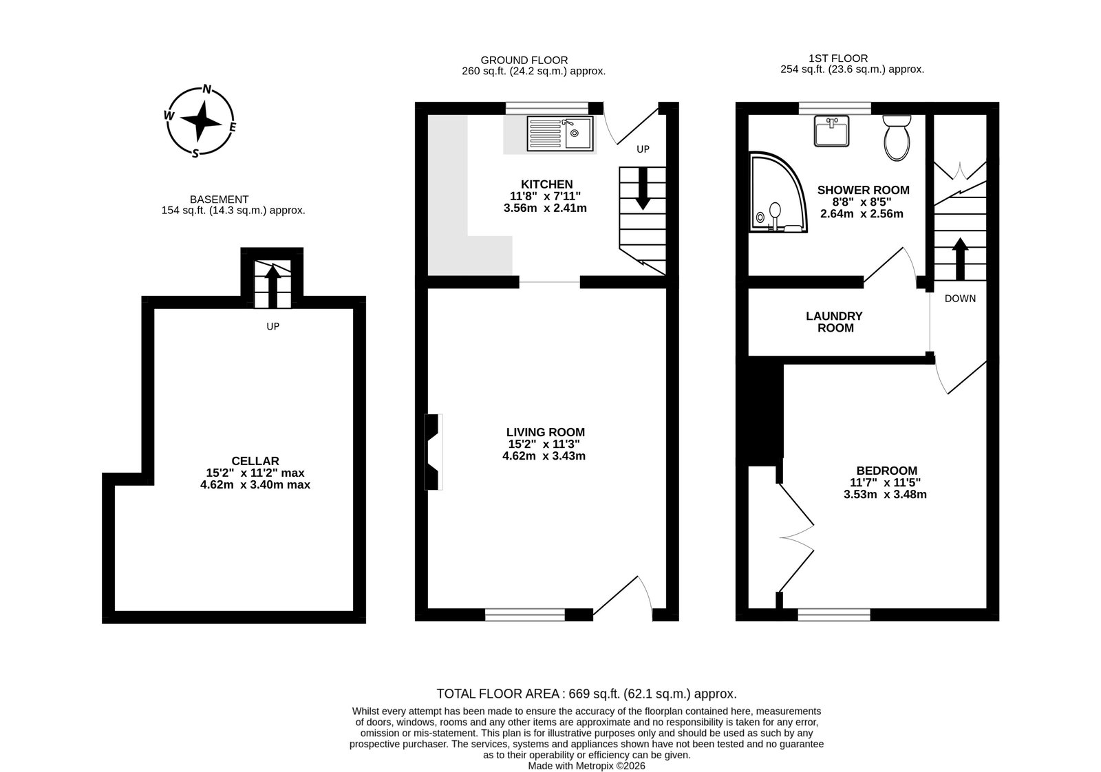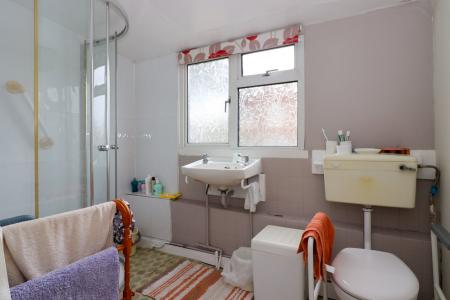 Stairs from the kitchen lead up to the first floor, where there is a laundry/storage room. A door opens to a double bedroom, with a double built-in wardrobe and a window to the front. Off the landing is a shower room, with a corner shower cubicle, wash hand basin and wc.