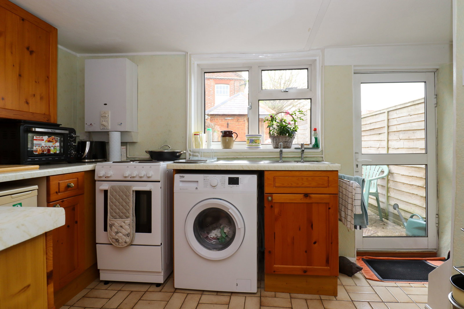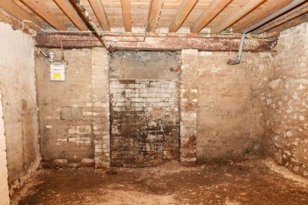 The front door opens to the living room, where there is a fireplace and window to the front. An opening leads through to the kitchen, which has a range of fitted units and worktops. A hatch in the floor opens to some steps down to the cellar, which runs under the living room.