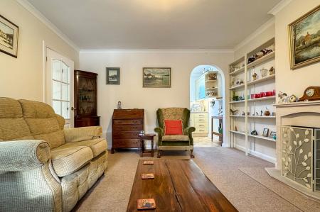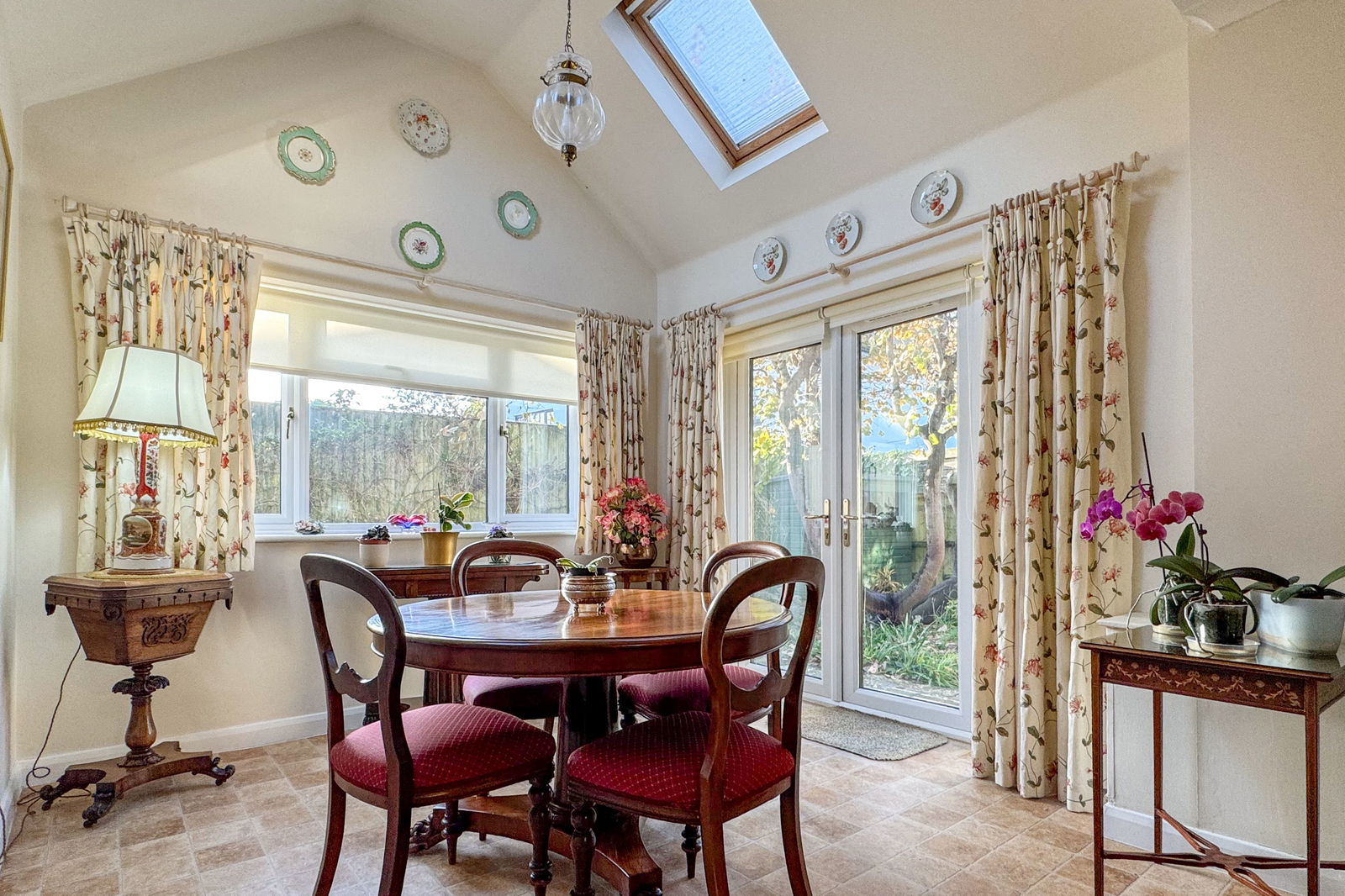 A generous entrance porch with excellent built-in storage opens into a welcoming hallway, which leads to the principal rooms. The well-proportioned kitchen is fitted with a range of base and eye-level units along with selected integrated appliances, and flows seamlessly into the bright and spacious sitting room featuring a charming fireplace. To the rear, a superb vaulted dining extension offers an impressive sense of space, complete with underfloor heating, skylights and double doors opening onto the attractive, low-maintenance garden.