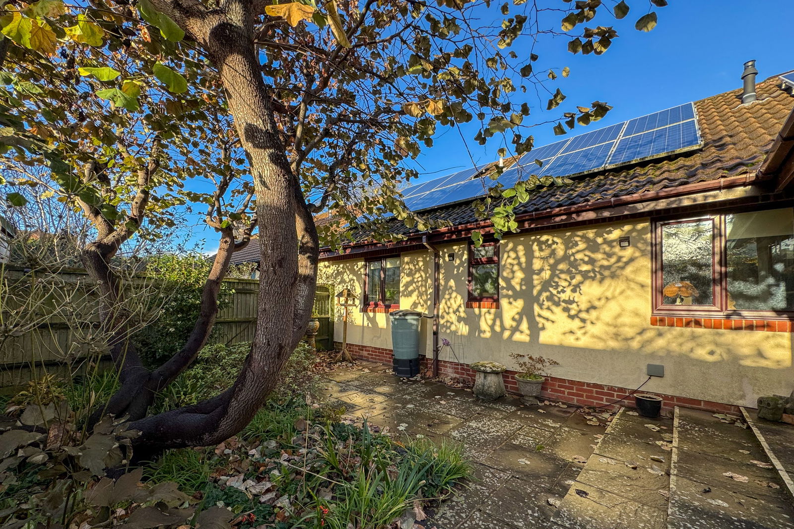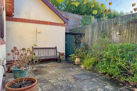 The rear garden is neatly paved, offering an inviting seating area perfectly positioned to enjoy the afternoon and evening sun. Additional features include a garden shed and gated side access.