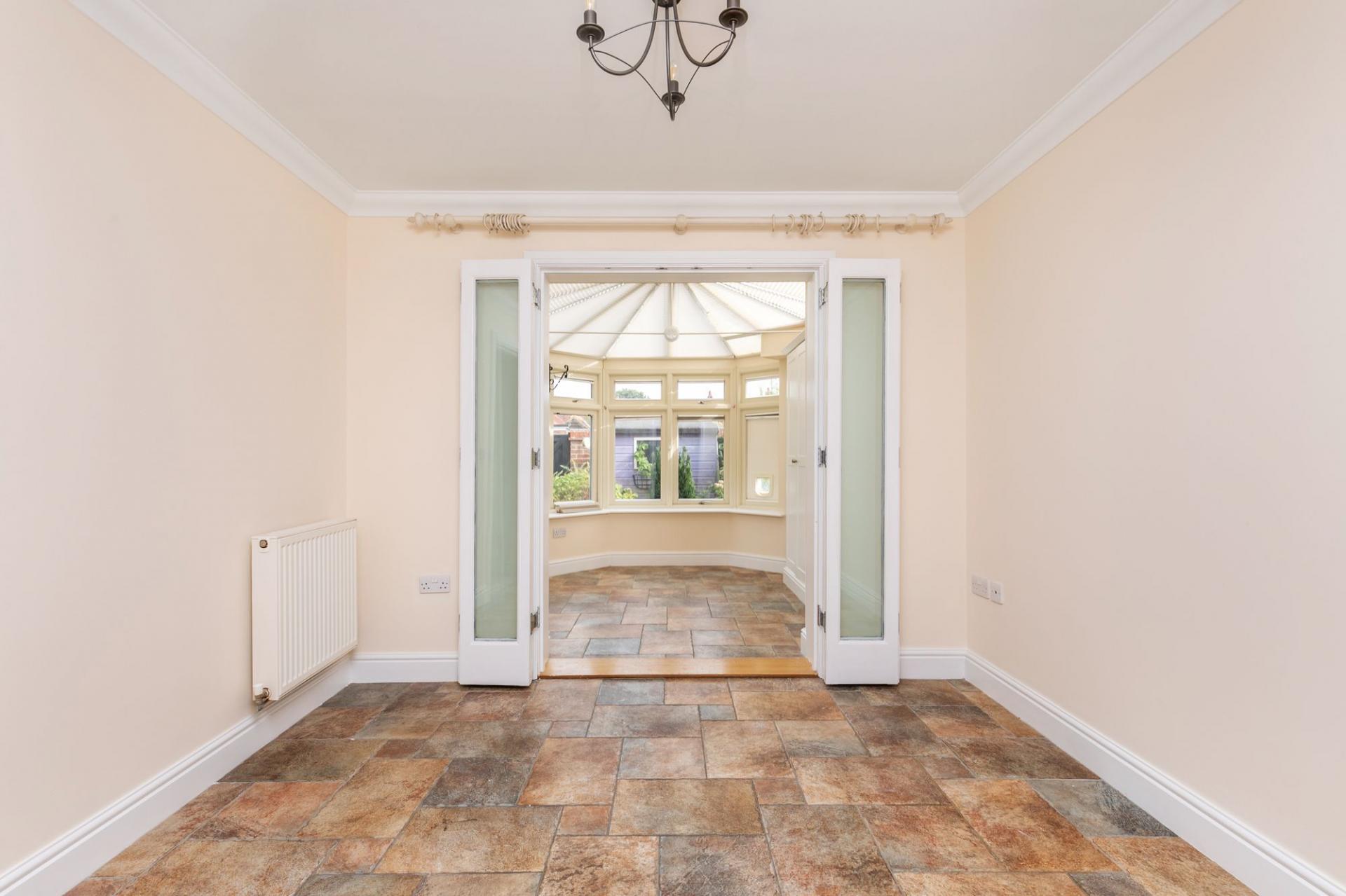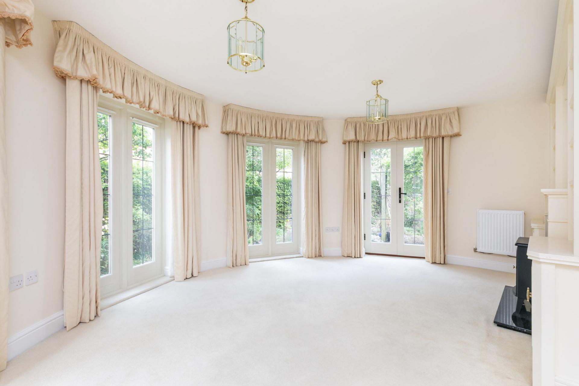 The front door is on the lower ground level, and opens to a spacious hallway, where there is a door to the integral garage. The upper ground floor is home to a lovely sitting room which takes advantage of the property's unique curvature, creating a stunning semi-circular room, with twin sets of French doors to the garden. There is a modern fitted kitchen with granite worksurfaces and integral appliances, the kitchen opens directly to the dining room. Folding doors from the dining room open to the lovely conservatory, which is located on the south side of the house and has French doors to the garden.