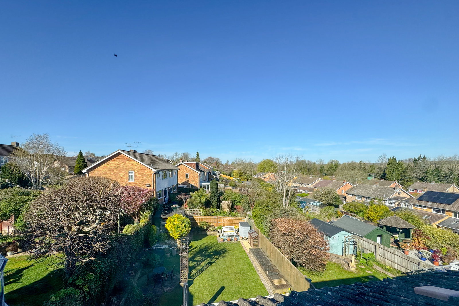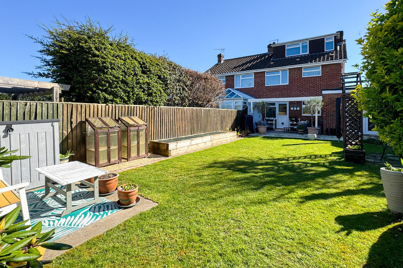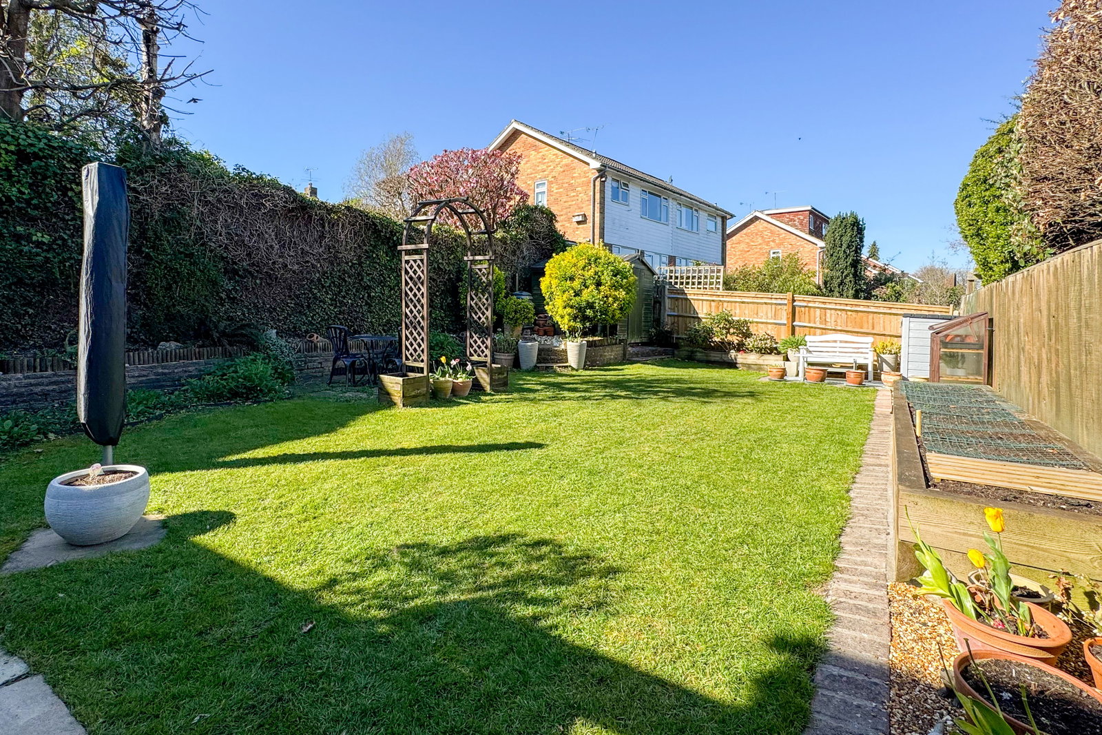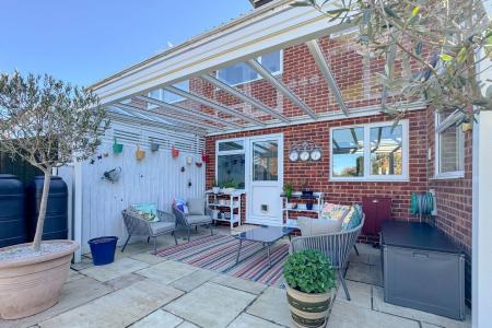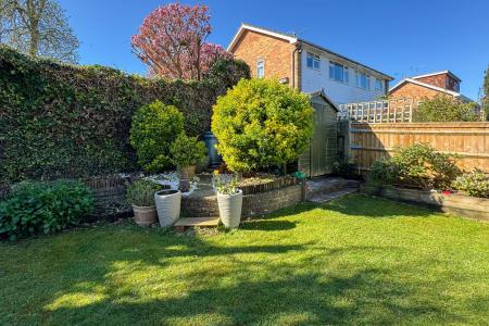 The garden is laid mainly to lawn with a covered patio providing shelter and a lovely seating area. Raised beds, lawn and a shed to the rear along with a further seating area at the rear of the garden that catches the morning sun.