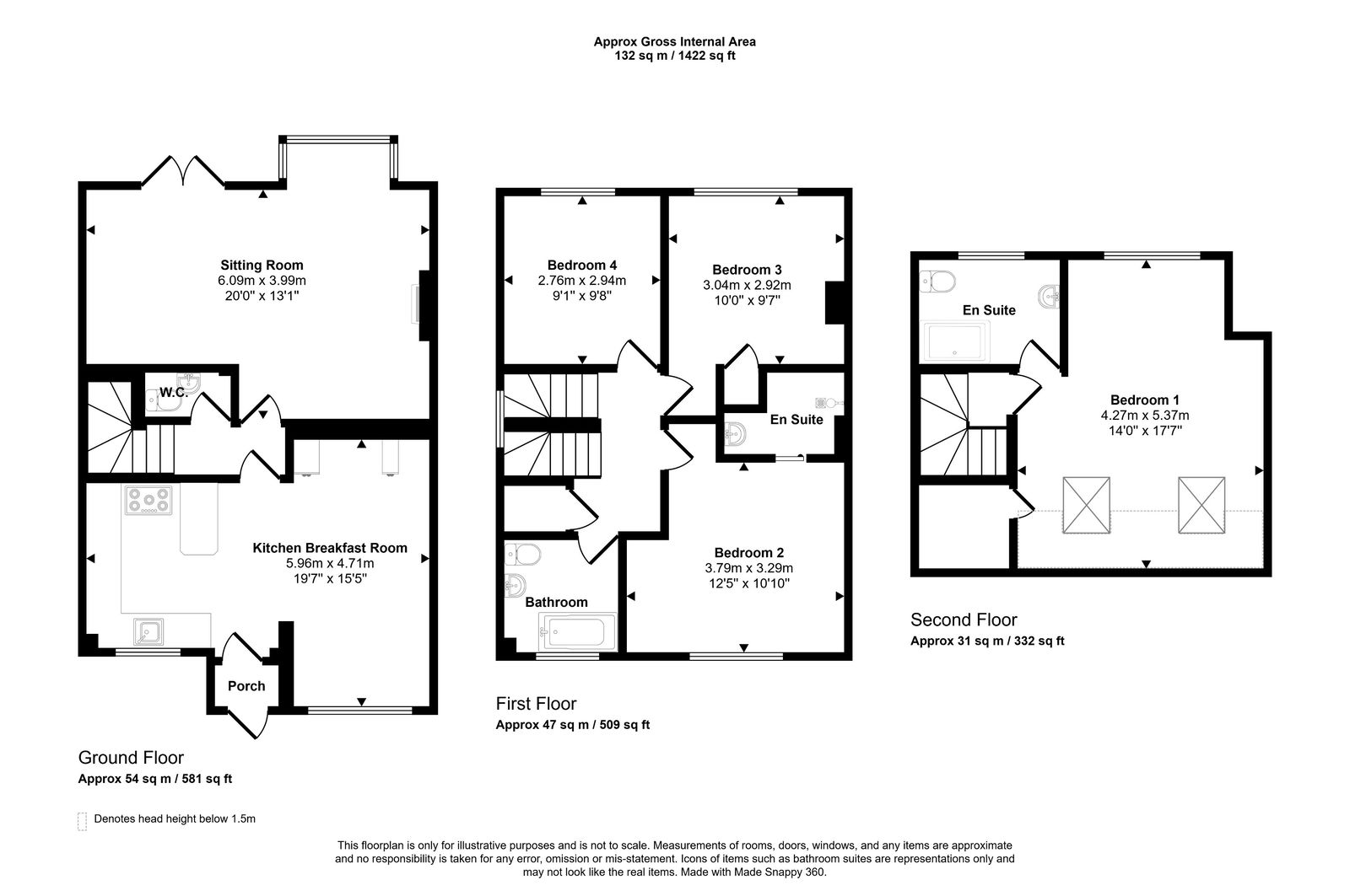 Upstairs, there are two generous double bedrooms — one with an en-suite shower and basin — along with a further single bedroom and a well-appointed family bathroom.