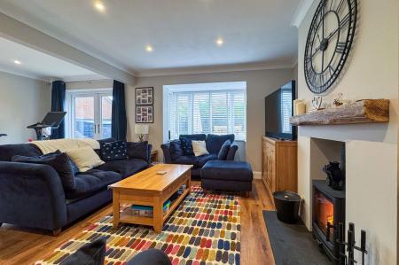 The welcoming entrance porch opens into a spacious kitchen/breakfast room, featuring excellent storage and ample space for a dining table — ideal for family meals or entertaining. The light-filled sitting room enjoys a bay window and a wood-burning stove, perfect for cosy winter evenings. Double doors open onto a generous rear terrace and the beautifully landscaped garden beyond.