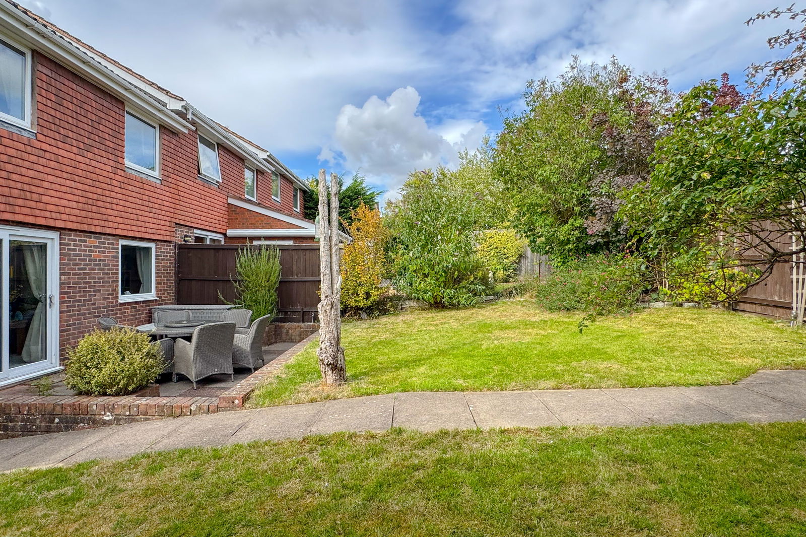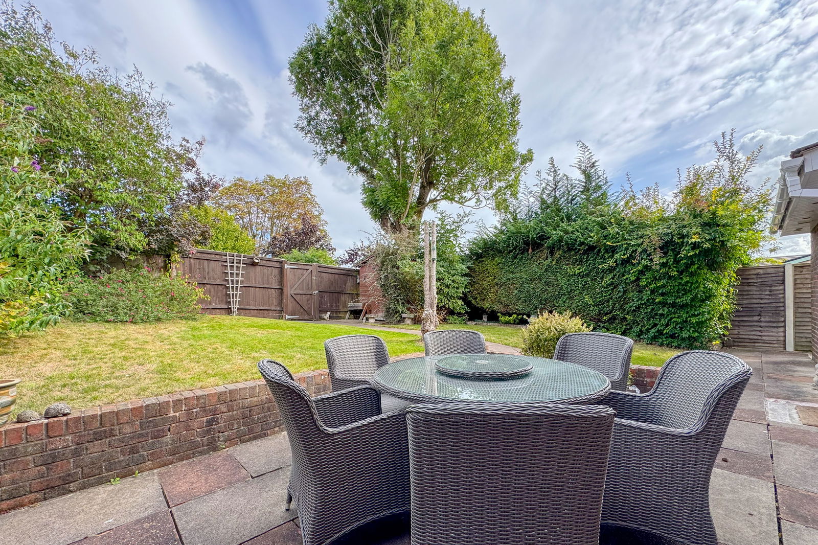 A path from the road leads to a gate and into the private and secluded front garden. The rear garden features a paved terrace adjoining the back of the house, with a ramped path leading up to a lawn, with a further path to a rear gate.