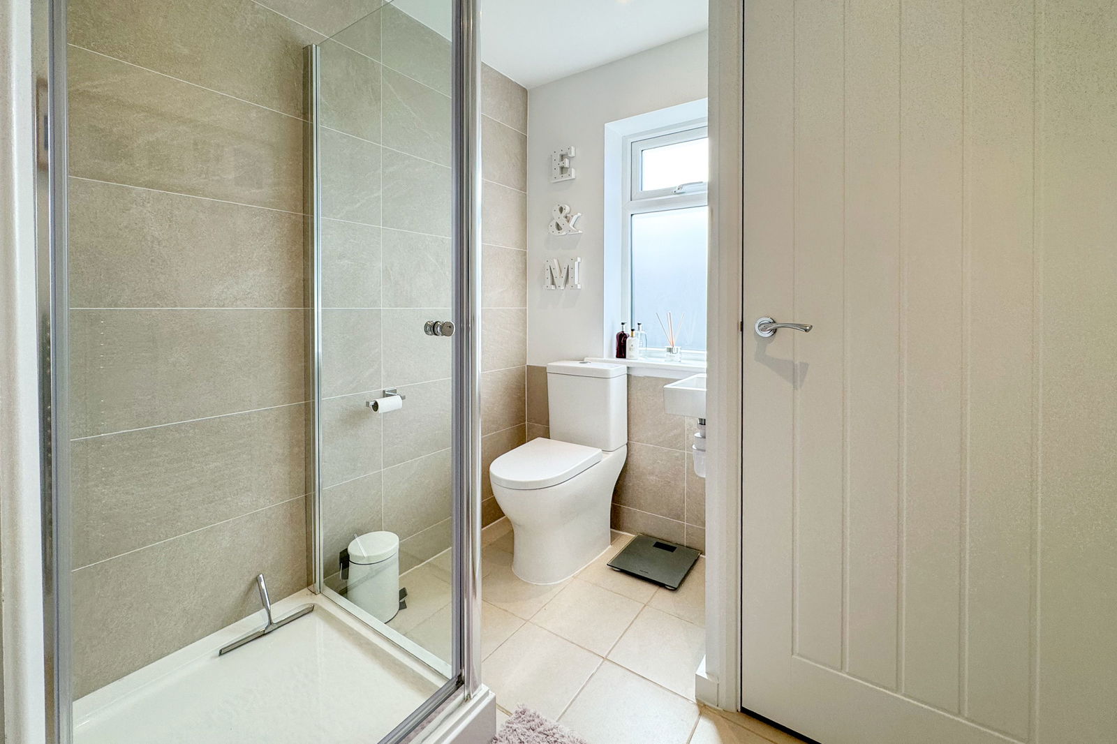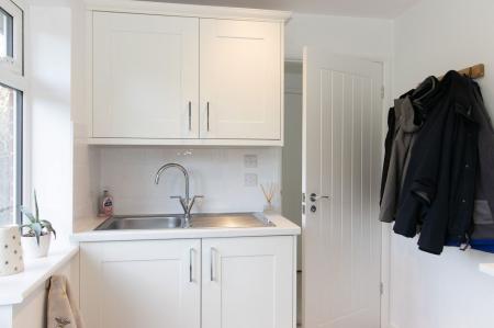 The front door opens to a hallway, where there are stairs to the first floor and a cloakroom. The L-shaped sitting room is a sizeable room allowing plenty of sofa space, with sliding doors to the garden. The light and airy kitchen has a range of sleek, modern units and worktops that flows seamlessly into the extension, where there is a dining area with fitted bench seating. Smart sliding doors open to the secluded front garden. A door from the dining area opens to a utility room, with a door to the garden. Off the utility room, there is a immaculately presented shower room.