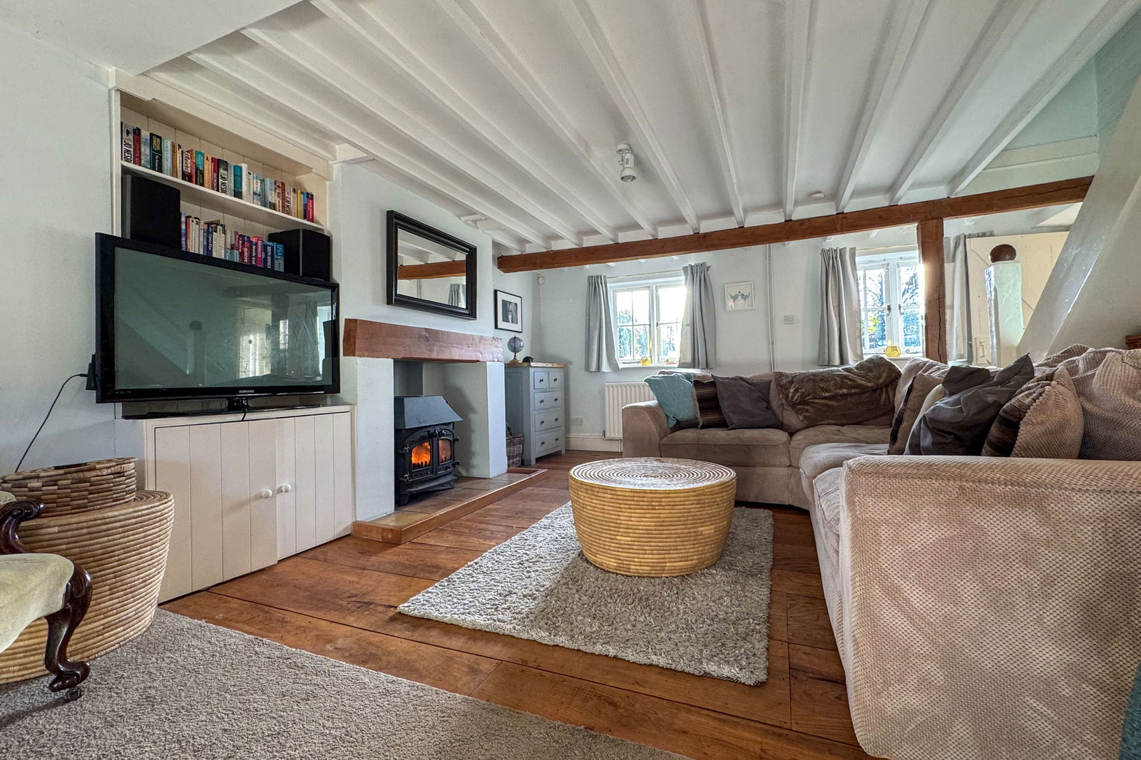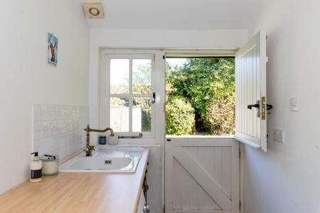 The cottage is approached from the gravel driveway, a lavender bordered path leading to the front door. You enter the property through the porch which leads onto the spacious double aspect kitchen/dining room, which is the heart of the home. Slate flooring, shaker-style units, a built-in dresser, and an AGA add character to the room, as does the fireplace with wood-burning stove. Off the kitchen is a utility room, cloakroom and study. Please note the study is subject to a flying freehold from the neighbouring property. The generously proportioned sitting room straddles the depth of the house, with built-in storage, a fireplace with wood-burning stove, and stairs to the first floor. Double doors lead through to a hallway, where there is a shower room and adjoining storeroom. Wooden ladder stairs lead up to a spacious loft room. A wonderful South facing garden room enjoys a sunny aspect, with French doors opening to the garden.