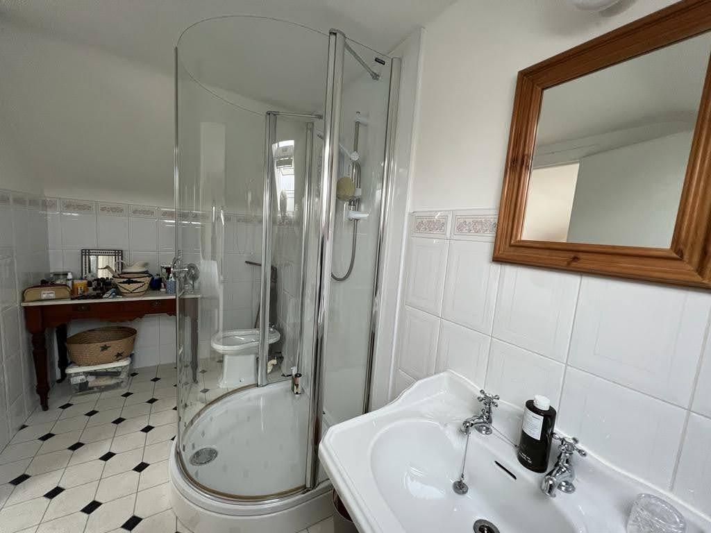 Comprising bath with electric shower over, shower screen, whb and wc, partly tiled walls, tiled floor.