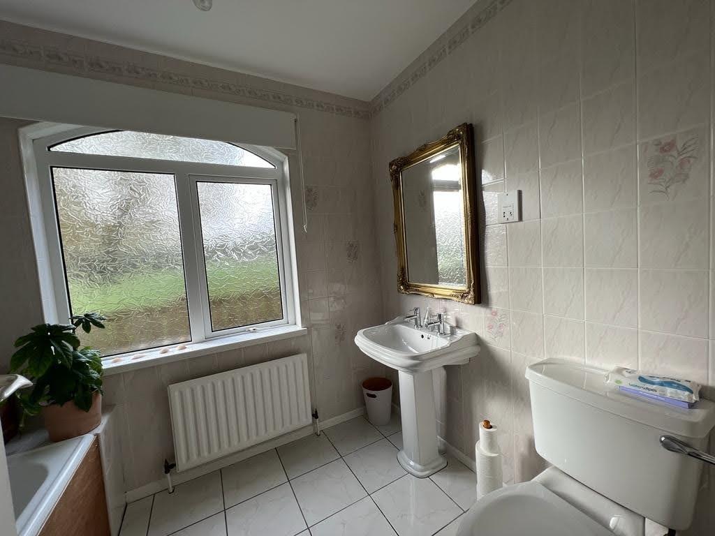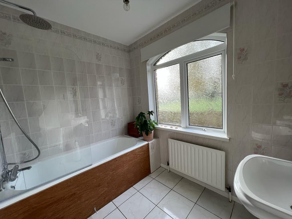 Comprising bath with shower fitting to taps, shower screen, whb and wc, fully tiled walls and floor.