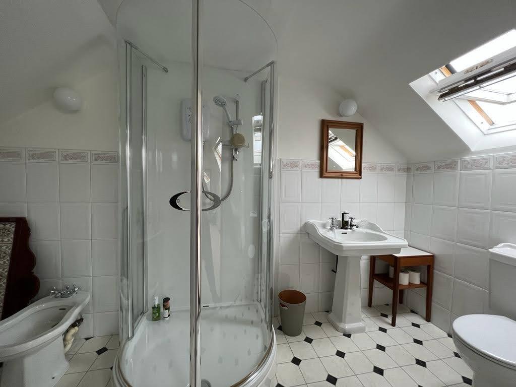 Comprising walk in electric shower with PVC cladding to walls, bidet, whb and wc, partly tiled walls.