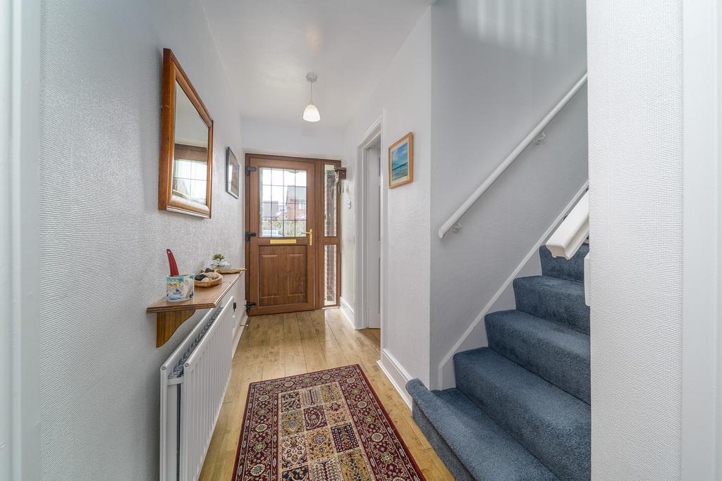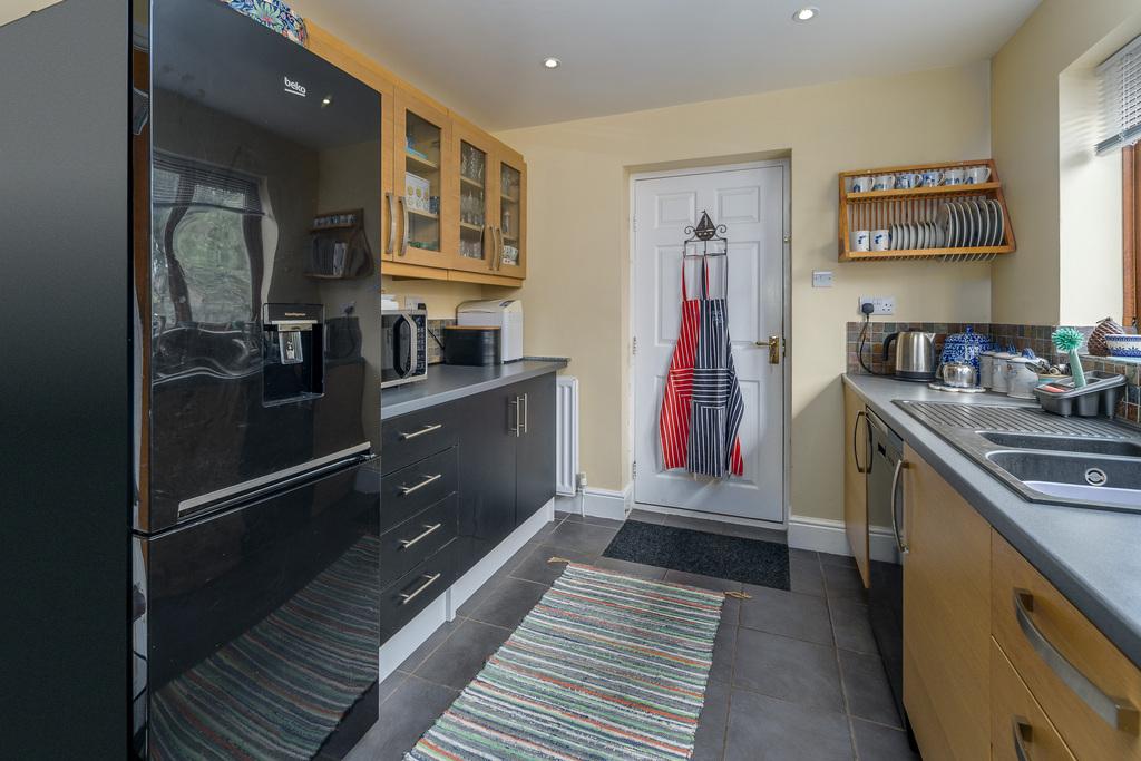 The space beneath the stairs has been used creatively to accommodate a ground floor WC. The suite comprises a close coupled toilet with a push button and a wall hung hand wash basin. A built-in wooden shelf and tiled splash back completes the look of this beneficial space. A further door provides entry to the garage which offers excellent storage and a utility space where there is single bowl stainless steel sink within the work surface, plumbing and space for a washing machine and space for a tumble dryer. A loft hatch gives access to a partly boarded storage space above the garage, whilst the Baxi gas boiler is housed in the garage for ease of access and a door opens to the rear garden.