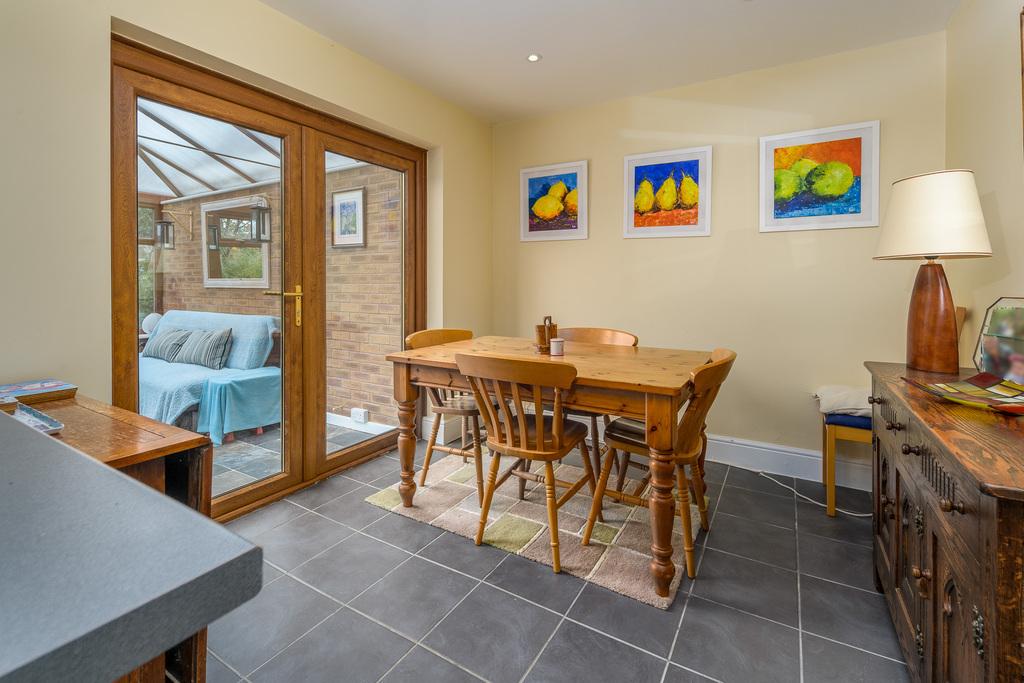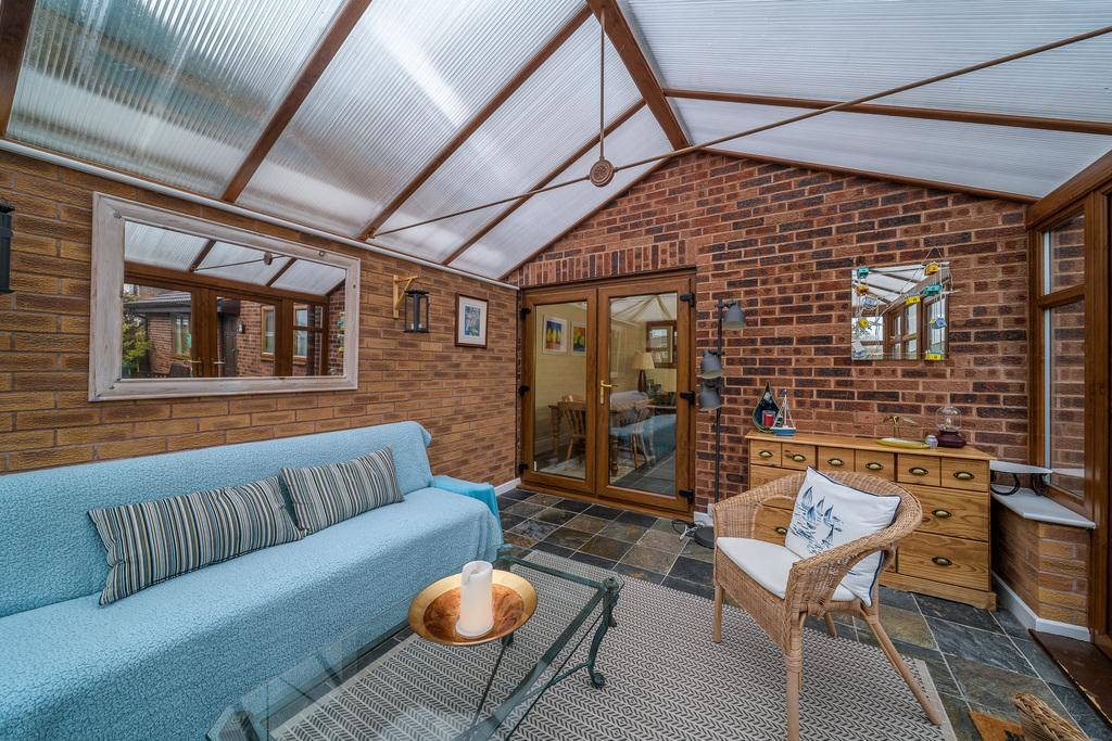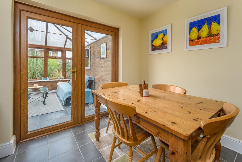 Located to the rear of the property, the kitchen-diner is a sociable and spacious family space which appeals to modern living. The kitchen offers a good number of wall and base units, designed with a combination of black and wood effect doors, complemented by a contrasting grey speckled laminate work surface and an earthenware tiled splashback. There is a breakfast bar, which incorporates a wine rack and offers further seating and workable bench space, a bowl and a half acrylic sink with a mixer tap above, space for a large five burner range cooker with a chimney style extractor fan above, space for a free-standing dishwasher and a full-size fridge freezer. A window provides uninterrupted views of the rear garden, and a pair of double doors open into a conservatory which takes full advantage of the garden views via its many windows. This is a superb additional living space, allowing you to relax and enjoy the garden views throughout every season. The space is finished with a practical and attractive tiled floor and would be ideal as a dining room if you so wished.