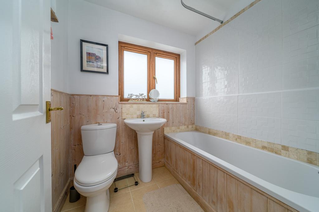 The family bathroom comprises a close coupled toilet with a push button behind, a full pedestal hand wash basin and a chrome heated towel rail. The space is tiled around the bath with embossed white tiles which work in harmony with the half height wood panelling around the walls. A window allows for natural light and there is an additional loft access available.