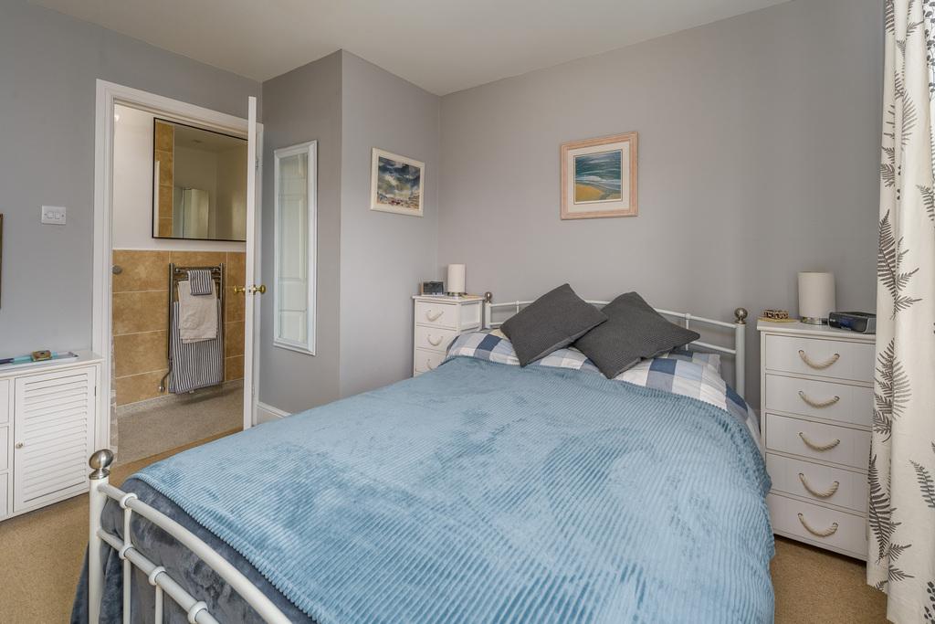 The primary bedroom, with en-suite facilities, is a spacious double room with a large window overlooking the front of the property. This restful room offers plenty of fitted wardrobes offering excellent storage potential. The en-suite comprises a walk-in shower behind a shower curtain, a close coupled toilet with a push button behind, a corner wall hung hand wash basin and a chrome heated towel rail. The space is finished with non-slip flooring, sandstone-coloured tiling combined with attractively painted walls, and a window to the side allows for natural light. Additional lighting is by way of ceiling spotlights.
