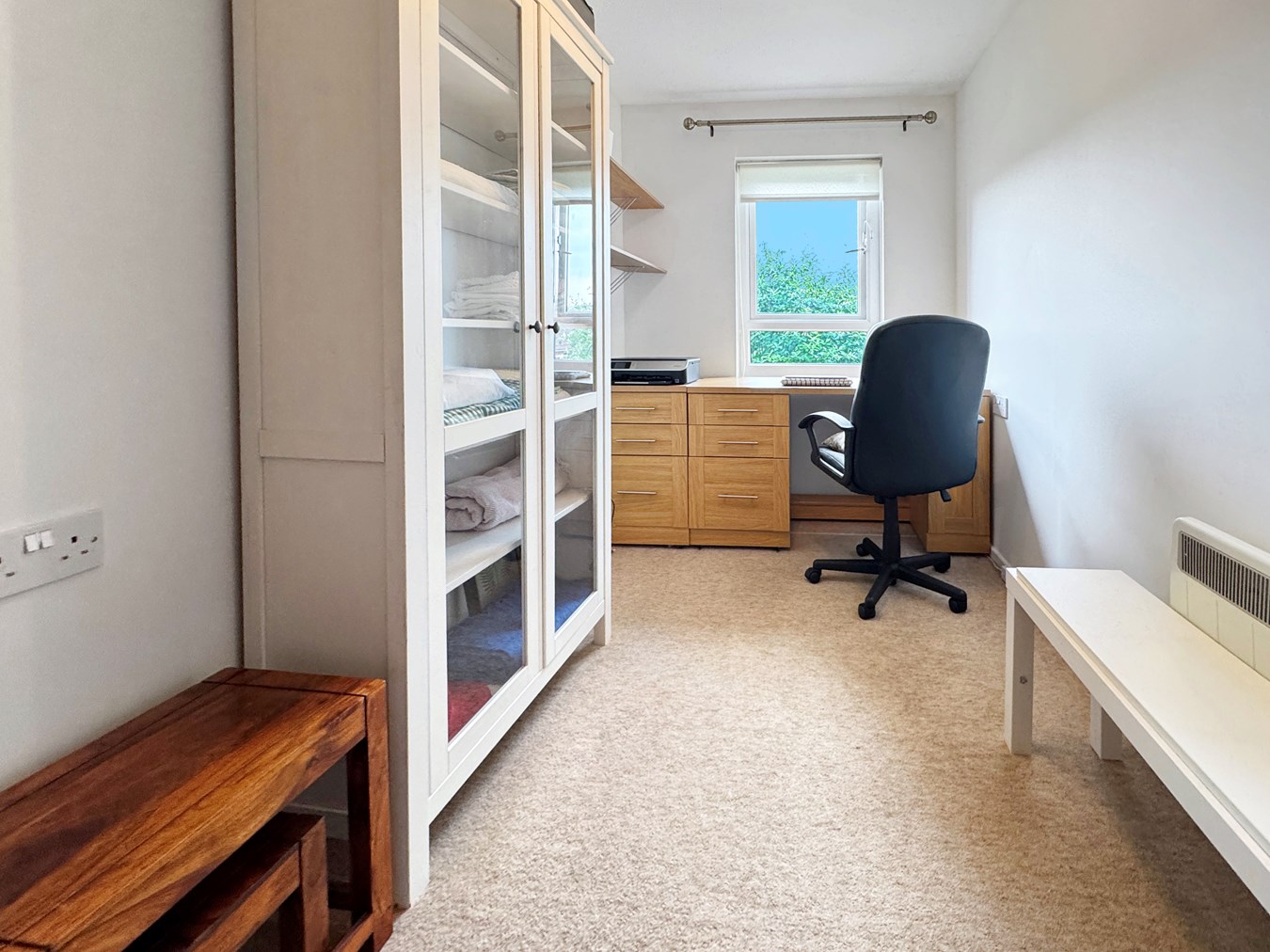 A single room with views to the communal gardens, electric radiator.