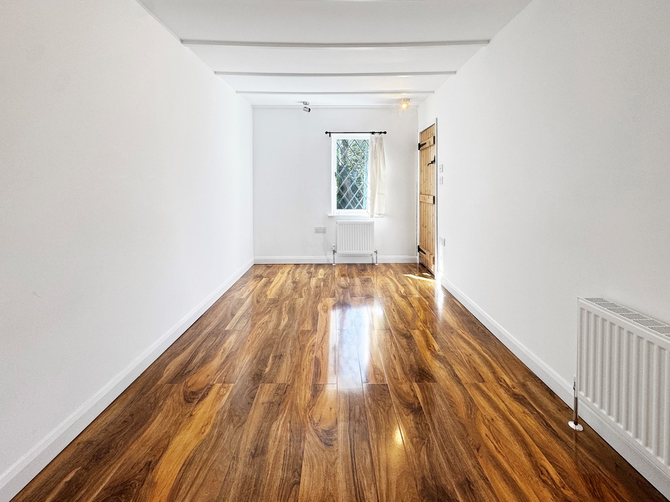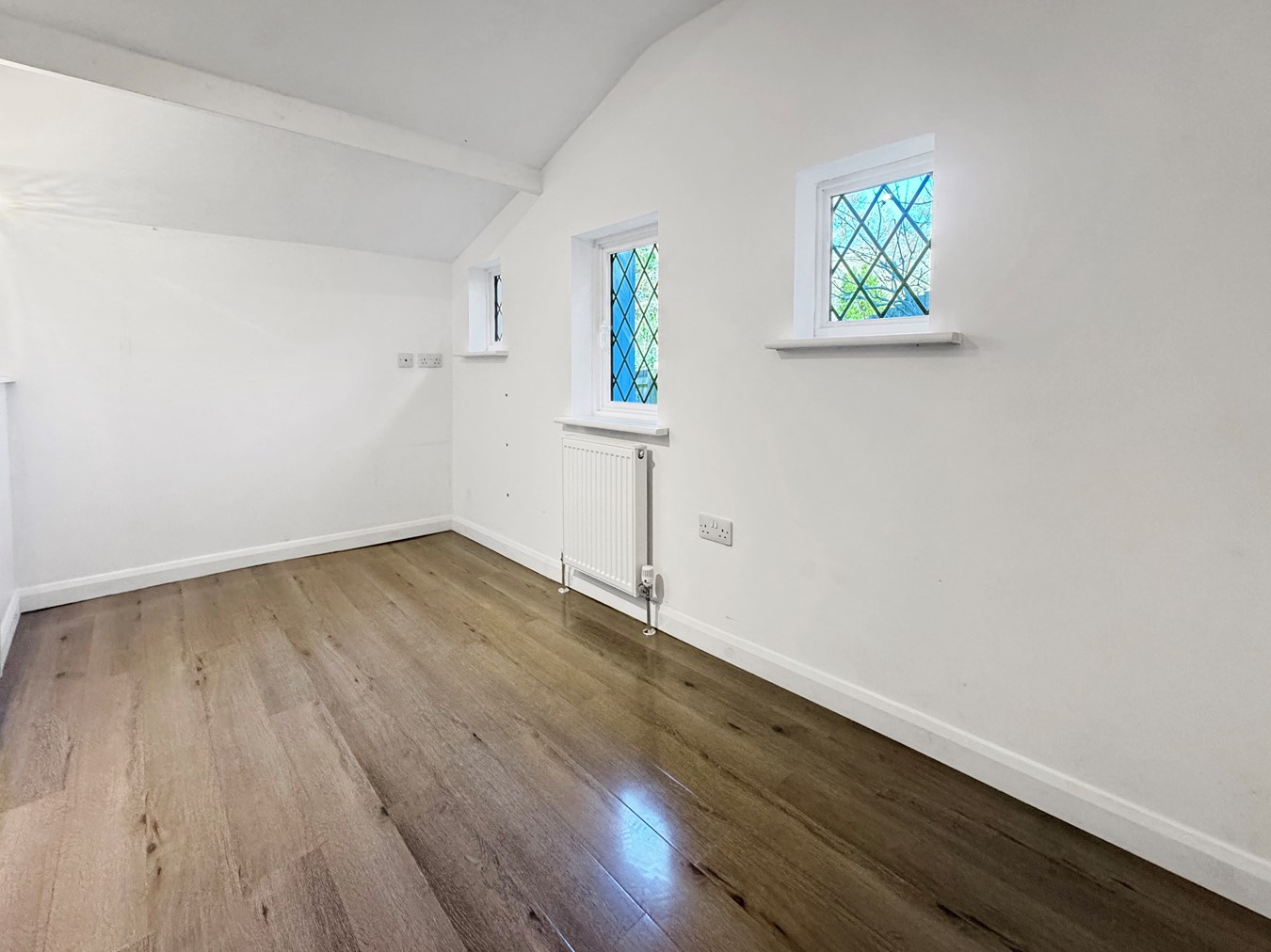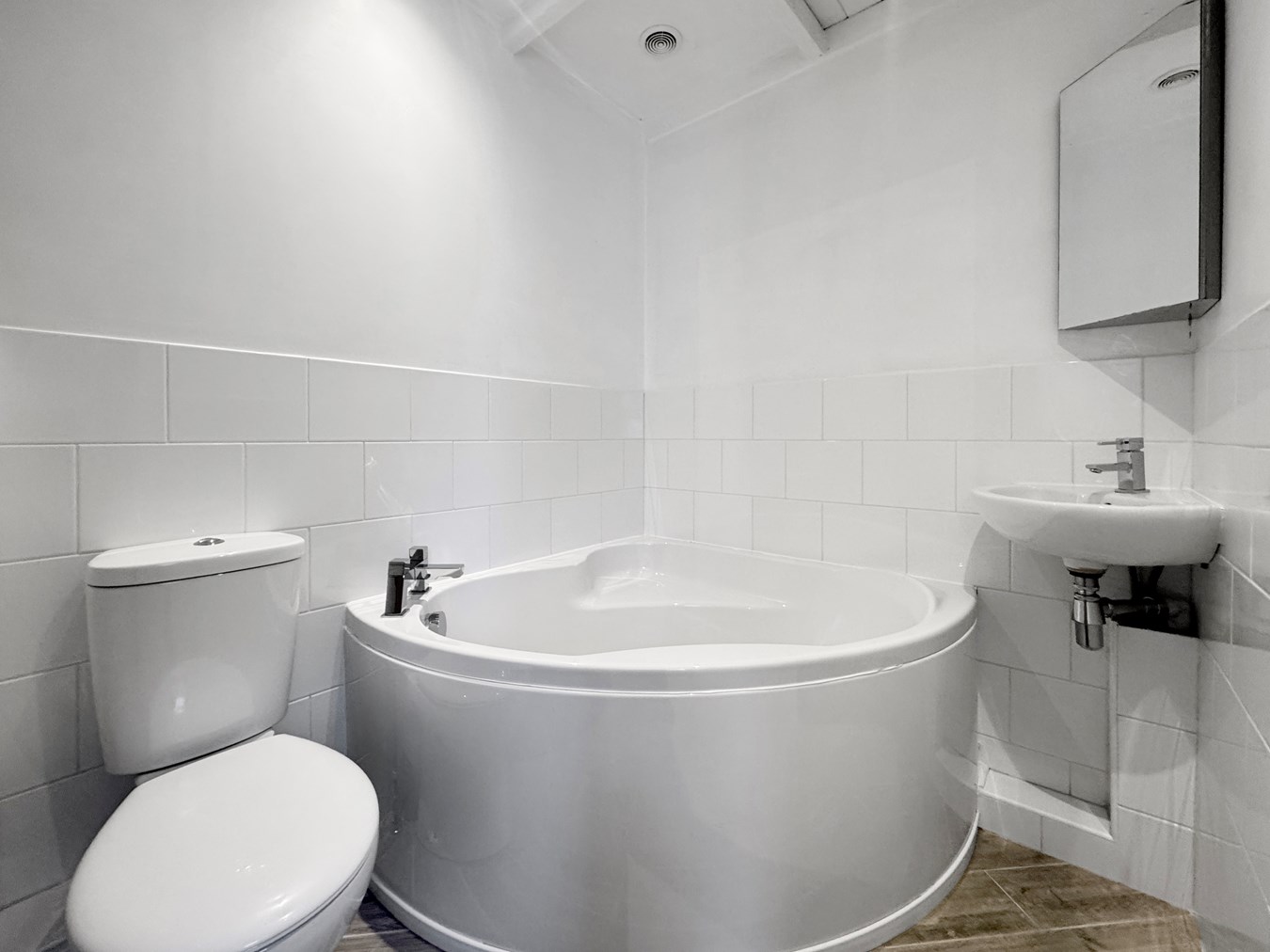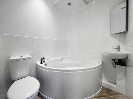 The main bathroom, accessed from the kitchen, comprises a corner bath, WC, and wash hand basin, and also benefits from a loft hatch for practical storage above.
