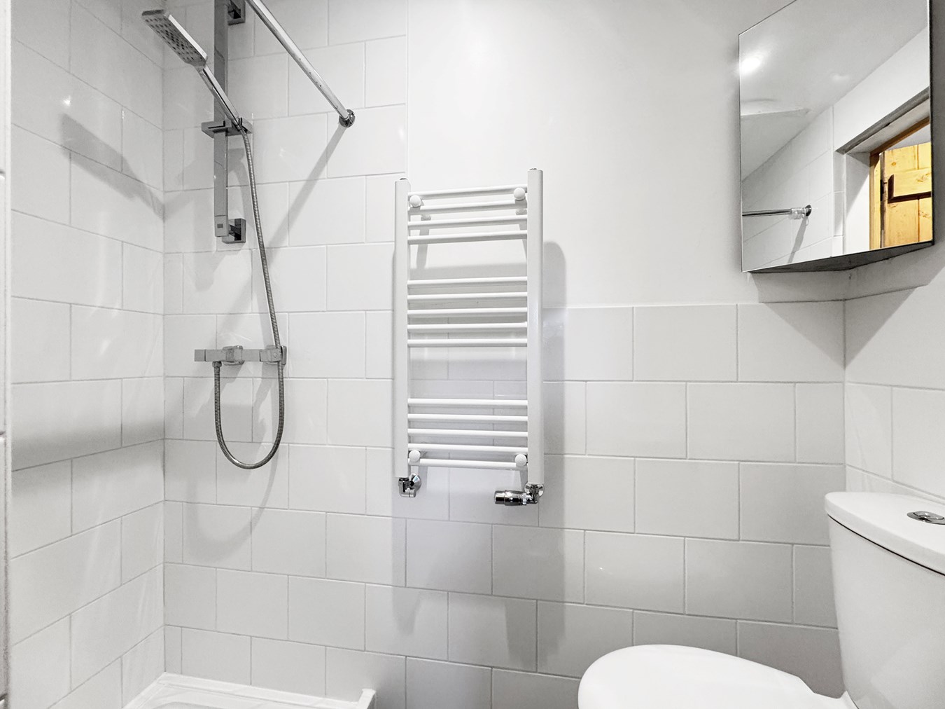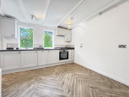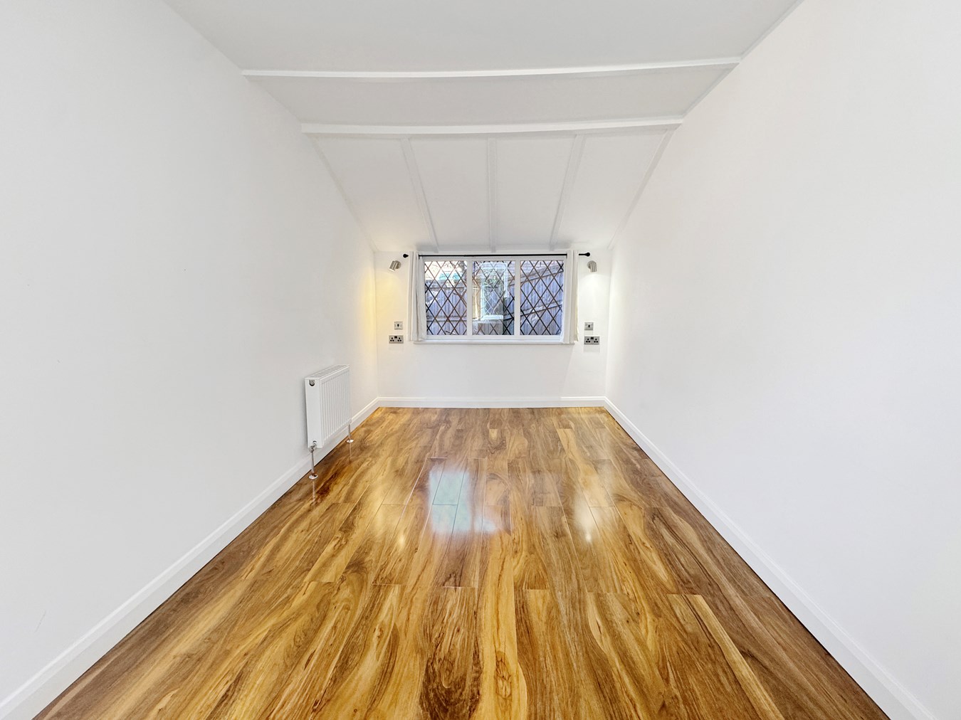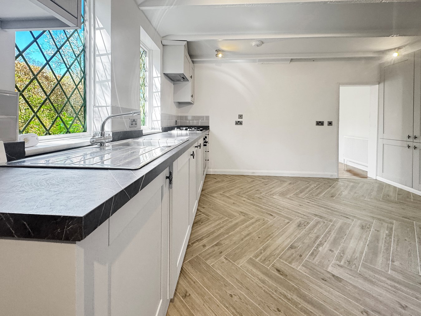 The main bathroom, accessed from the kitchen, comprises a corner bath, WC, and wash hand basin, and also benefits from a loft hatch for practical storage above.
