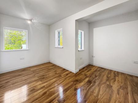 Leading off the kitchen, the living room is enhanced by an impressive floor-to-ceiling feature window, offering delightful views and a strong connection to the surrounding woodland, beautifully complemented by wood-strip flooring. A single door opens onto a Juliet balcony, further enhancing the room and allowing the outdoors to truly flow inside. Additionally, a loft hatch provides convenient access to the roof space, adding practical storage options.