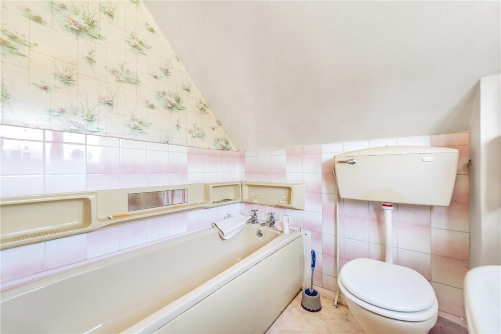 Upstairs leads to a well-proportioned family bathroom comprising a bath, WC and pedestal wash basin. The first floor also offers two generous double bedrooms. Bedroom One is a spacious double featuring fitted wardrobes and a radiator. Bedroom Two is another good-sized double room with fitted wardrobes and includes an access hatch to the loft, providing convenient additional storage potential.