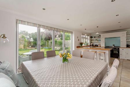A most welcoming entrance hall greets you on arrival with your eye immediately drawn down towards the open plan kitchen being the heart of the home for family living and entertaining. This is a wonderful space with a cream coloured fitted kitchen with a breakfast bar worksurface and ample storage units. The spacious dining area has bifold doors leading onto the garden patio and wraps around into the cozy sitting room with an ornate wood burning fireplace, feature bay window and hardwood floors. The ground floor accommodation is further made up of a handy study/office space, a utility room with space for a washing machine, fridge and storage cupboards, and finally a downstairs WC.