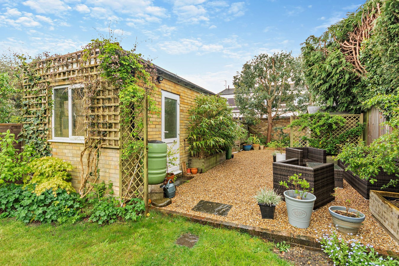 A nicely landscaped front garden with parking to the front and a pretty blue front door provides excellent curb appeal for this property. The rear garden is equally attractive providing a mix of patio for outdoor dining, a central lawn area and a lovely rear section of pebble dash for additional outdoor lounging and entertaining. There is a separate single garage accessed from the rear which also provides parking for one vehicle to the front of the garage.